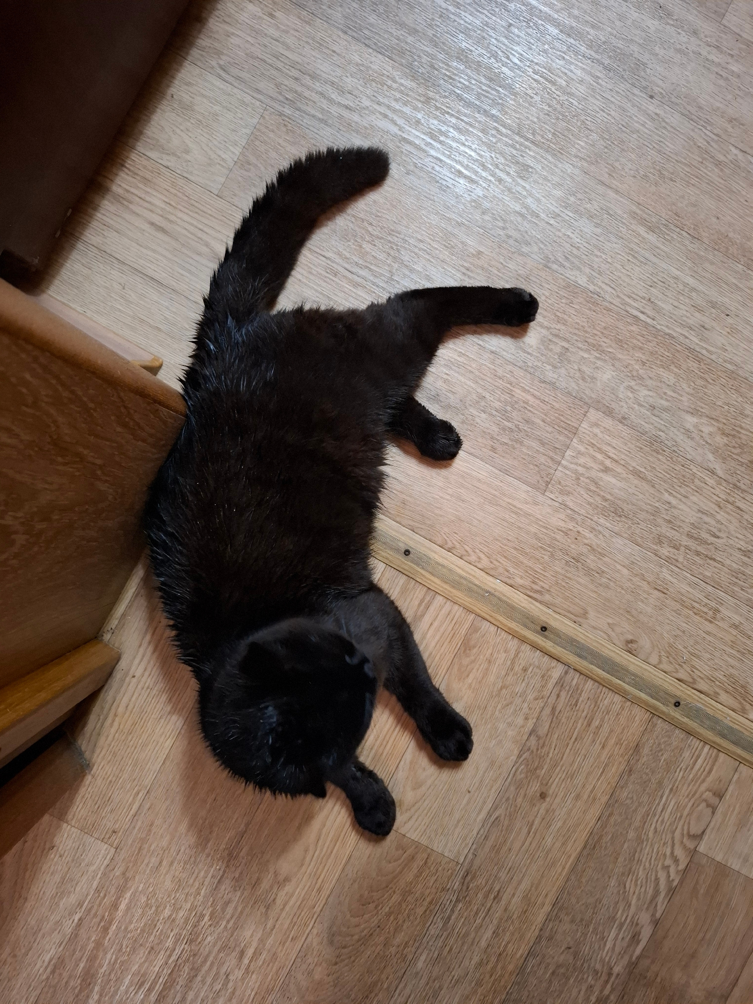 A black cat is lying on its back on a wooden floor, partially draped over the edge of a wooden cabinet. The floor has a wood grain pattern and is bordered by a strip of wood along one edge. The cat's…read more