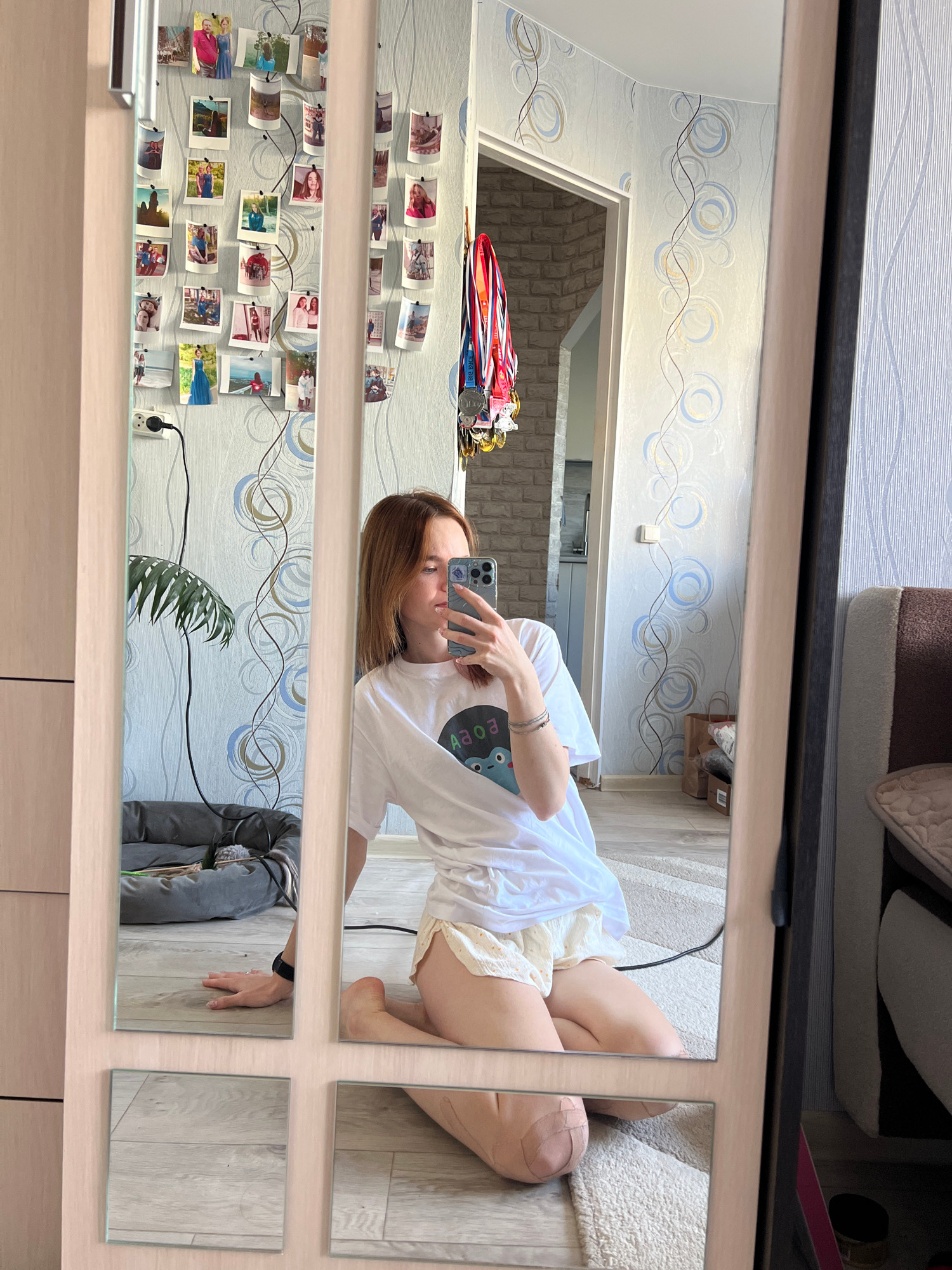 A young adult woman is reflected in a multi-paneled mirror in what appears to be an apartment or home in Chaikovsky, Russia. The woman is kneeling on a light-colored rug and holding a smartphone in he…read more