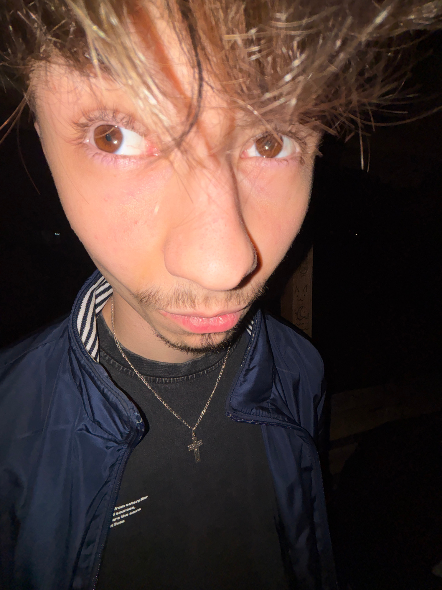 A low-angle selfie of a young male, taken at night. He has light brown hair, hazel eyes, and fair skin. He is wearing a black T-shirt, a blue jacket, and a silver cross necklace. The background is dar…read more