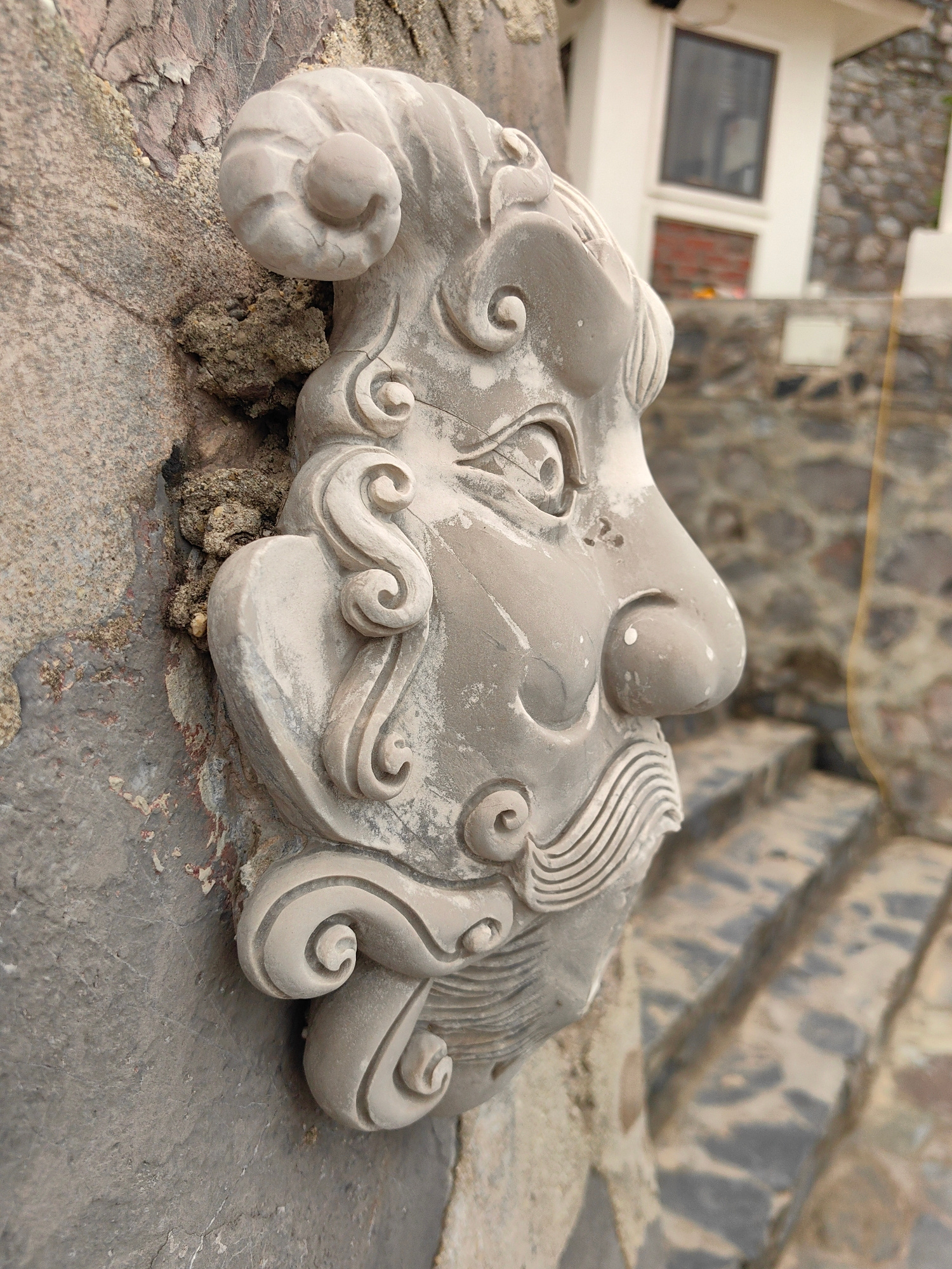 A close-up shot shows a decorative stone carving of a human face attached to a rough, textured stone wall. The face features stylized swirls and curls along its periphery, a prominent nose, and an eye…read more