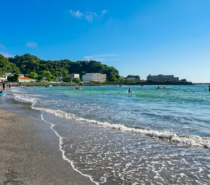 The image depicts a coastal scene on a beach in Mitoyo, Japan, under a clear blue sky with minimal white cloud cover. The foreground consists of dark grey sand, with white-foamed waves breaking and re…read more