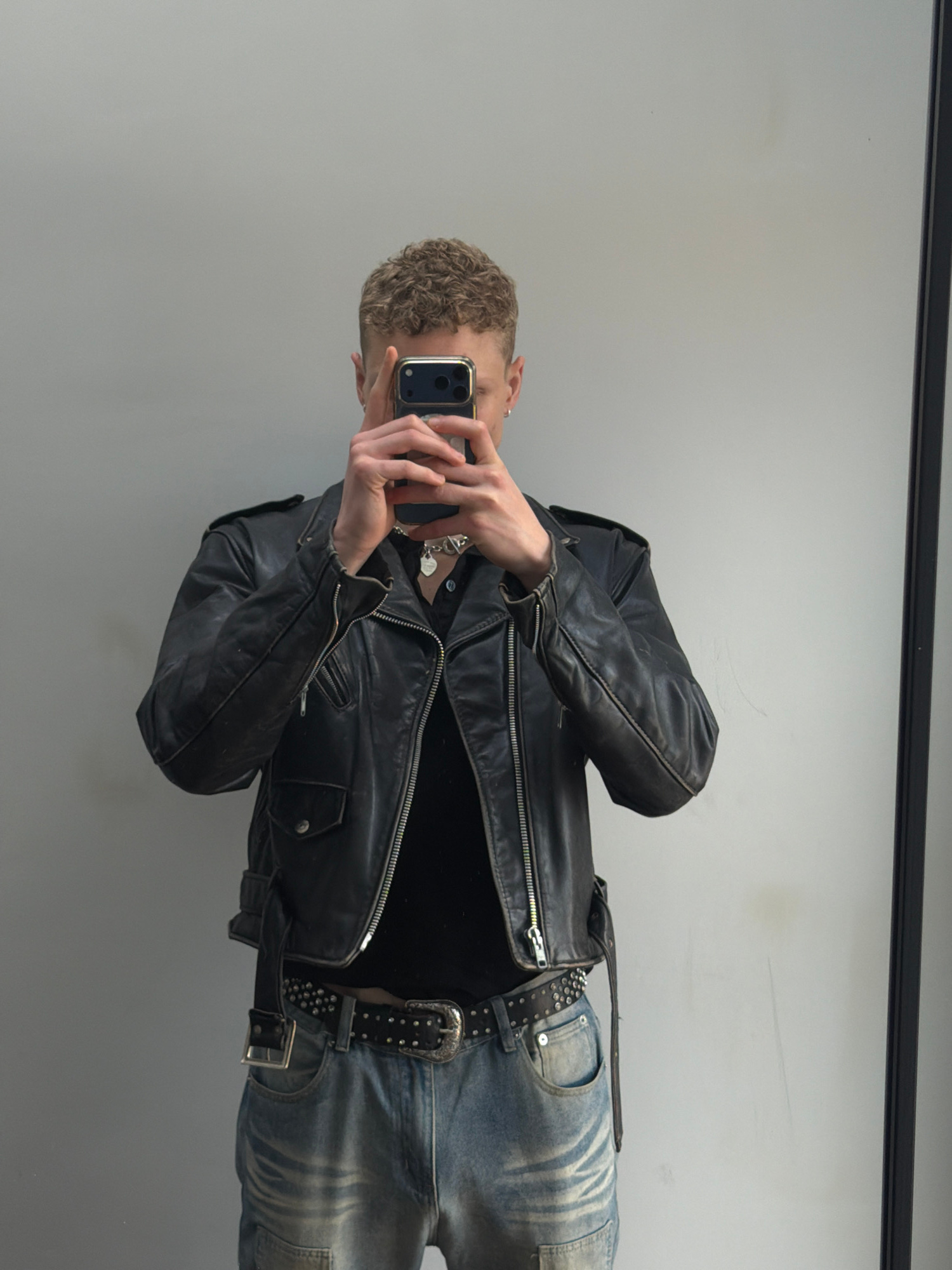 A person with curly blonde hair is taking a mirror selfie with a smartphone. They are wearing a black leather jacket, a black shirt, distressed blue jeans, and a studded belt with a large buckle. A si…read more