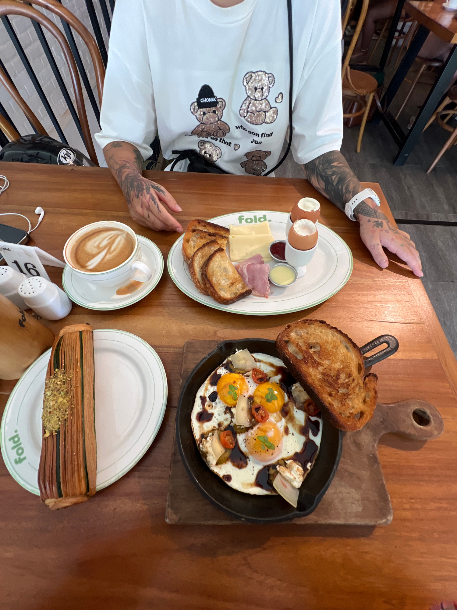 A top-down shot depicts a breakfast scene at "Fold" cafe, presumably located in North Kuta, Indonesia. A light-skinned person with tattooed arms sits to the left of the frame. They are wearing a white…read more