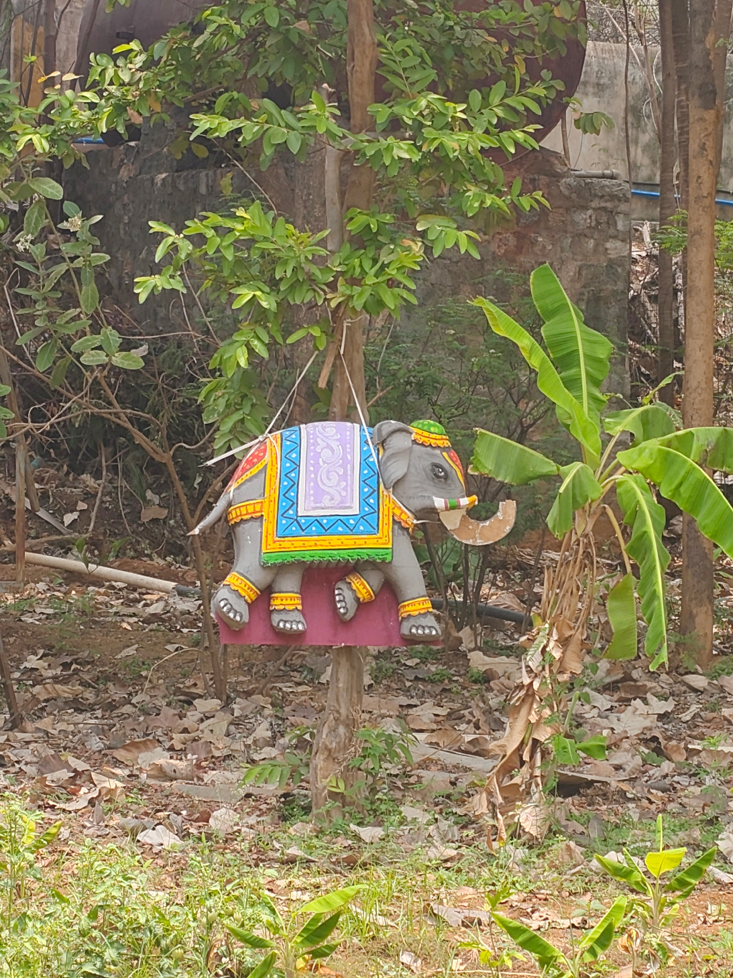 The image shows a colorful elephant sculpture hanging from a tree in an outdoor setting. The elephant is gray and adorned with a bright blue, yellow, and purple blanket. The sculpture is attached to a…read more