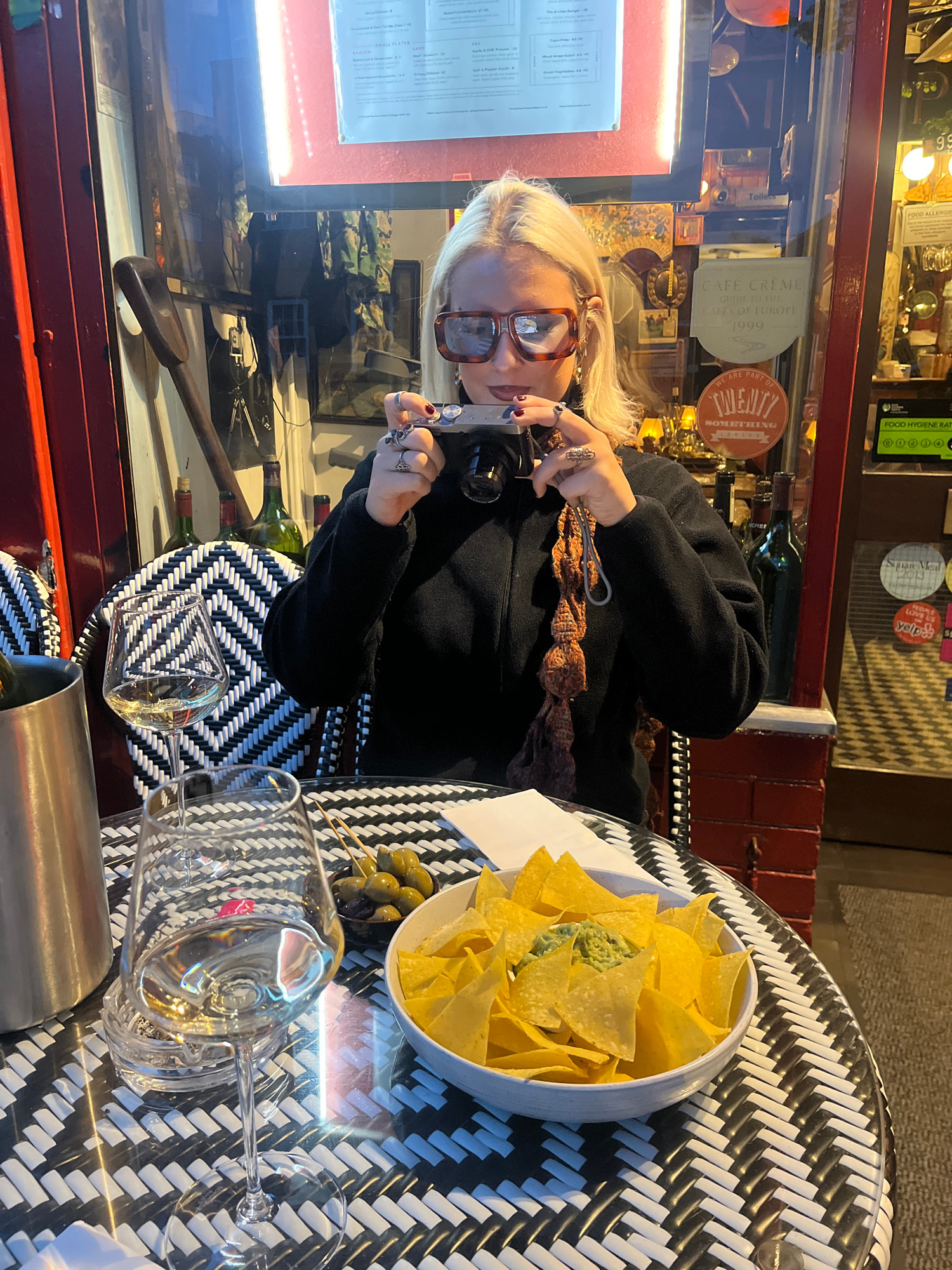 The image captures a scene inside a restaurant in London, United Kingdom. A fair-skinned blonde woman wearing spectacles and a black top is seated at a black and white wicker table. She is holding a small dark object, possibly a camera or a similar device, pointing it towards the table. A bowl of tortilla chips with guacamole and a small skewer of olives are present on the table along with a couple of wine glasses. Some reflections and a silver-colored cylinder are visible in the foreground on the table. Behind the woman is a red-framed display with a menu. Signs and stickers are also visible on the wall behind her, including "CAFE CRÈME," "TWENTY SOMETHING," "yelp," and "FOOD HYGIENE RATING." | Open Wire