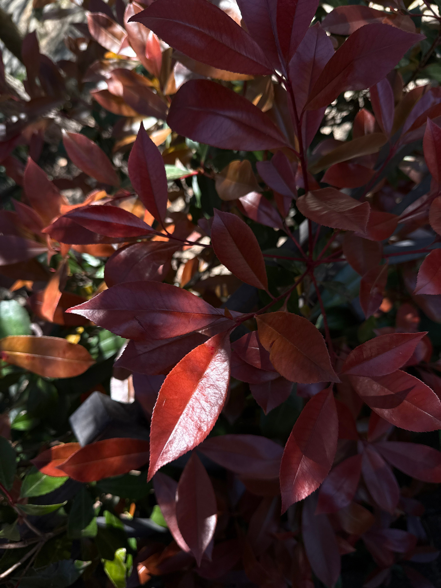 The image shows a close-up of Photinia shrubs with vibrant red leaves. The scene is well-lit with sunlight reflecting off the leaves. The background is blurred, suggesting a shallow depth of field. Th…read more
