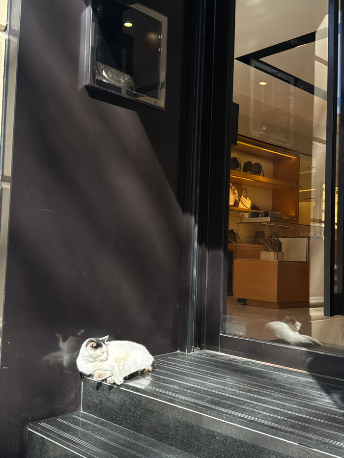 An outdoor scene in Şişli, Turkey, shows the facade of a commercial building under direct sunlight. A white cat with black and brown patches on its head and upper back is resting, curled, on black granite steps. These steps feature horizontal light gray grooves. The cat lies in a sunlit area. To the left of the cat, a dark, matte wall, possibly black or deep brown, shows linear scratch marks and diagonal patterns of sunlight and shadow. To the right, a dark-framed glass entrance or large window reflects a distorted, elongated image of the cat. Through the glass, the interior of a retail store is visible, featuring light wooden shelves and glass display cases exhibiting multiple handbags in various colors. Above the dark wall, a small, square, metallic-framed recessed display unit contains a light-colored object. | Open Wire
