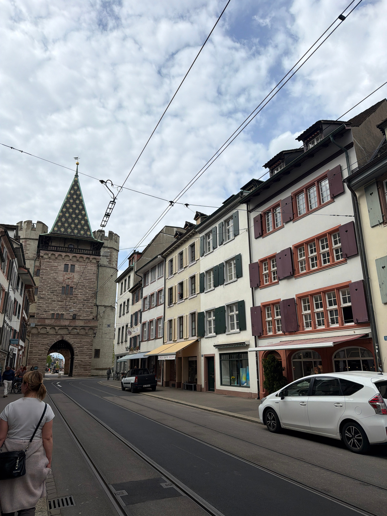 This image captures a vibrant street scene in Basel, Switzerland, featuring historical architecture, a tram line, and several people. The perspective is slightly angled, looking up towards the buildin…read more
