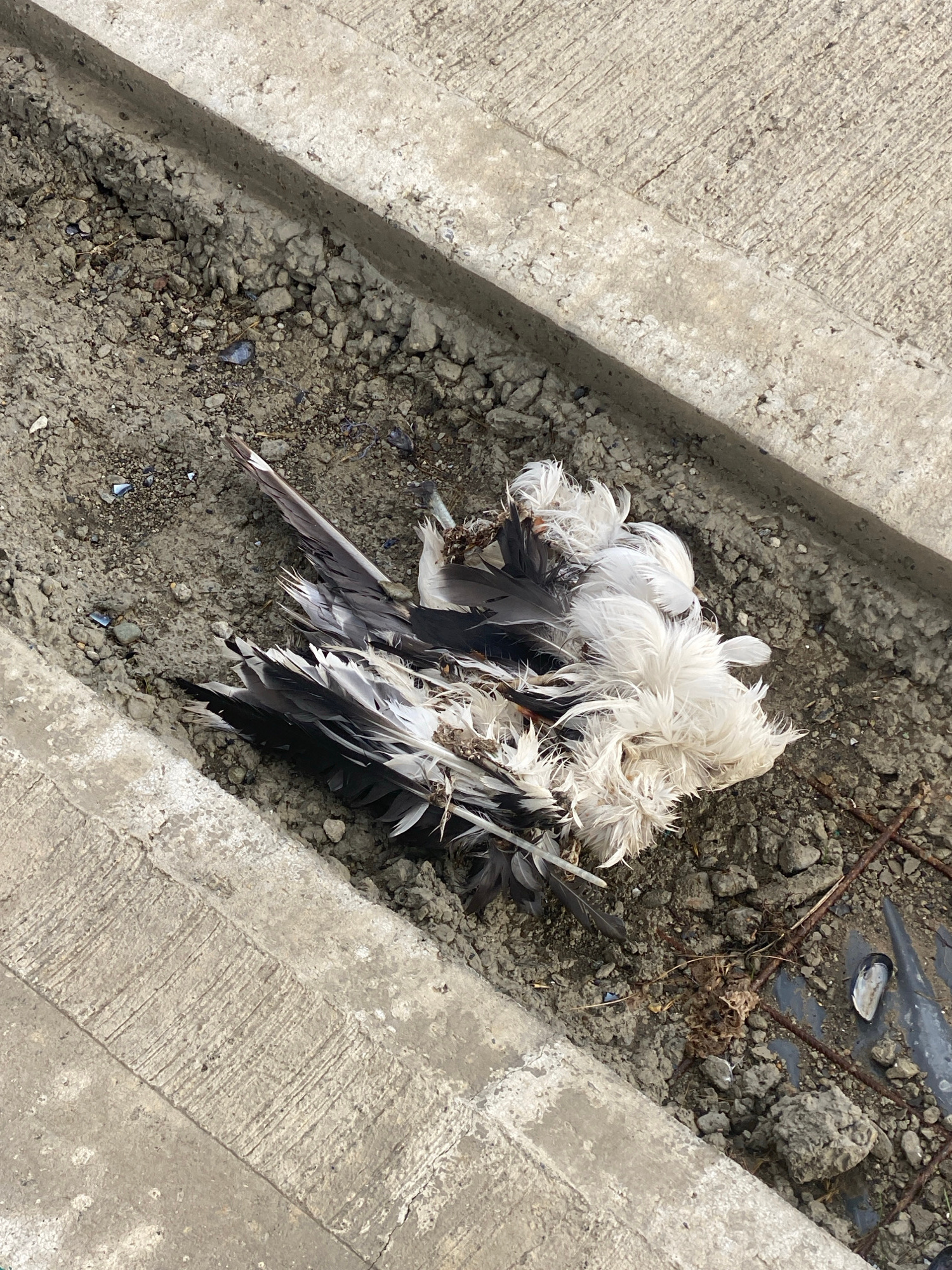 A dead bird lies in a concrete drainage ditch. The bird has white and gray feathers. The location is not ascertainable from the image.