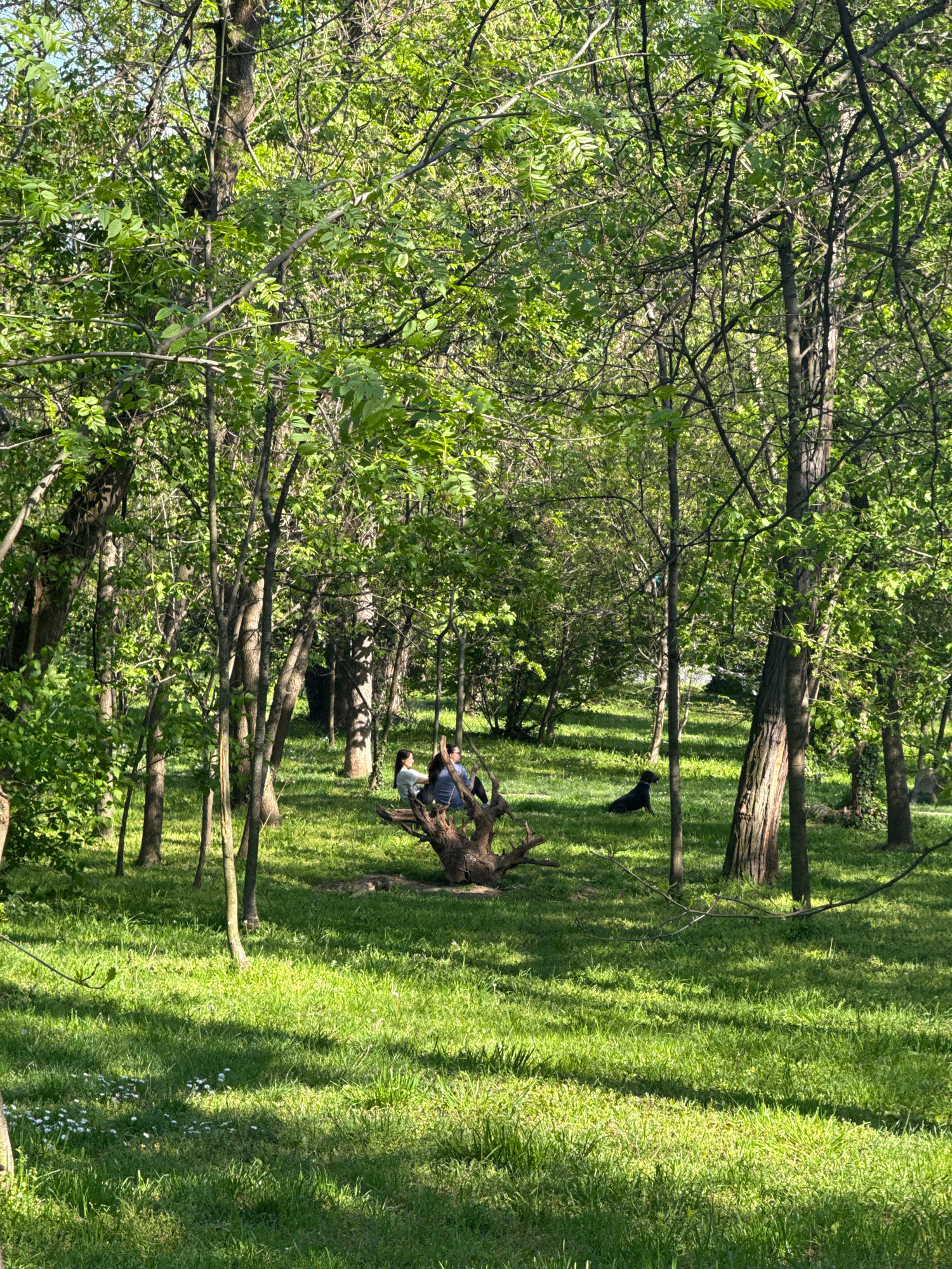 This image depicts a vibrant, sunlit outdoor scene, likely a park or a wooded area, set in Vozdovac Urban Municipality, Serbia. The setting is characterized by a lush green lawn interspersed with nume…read more