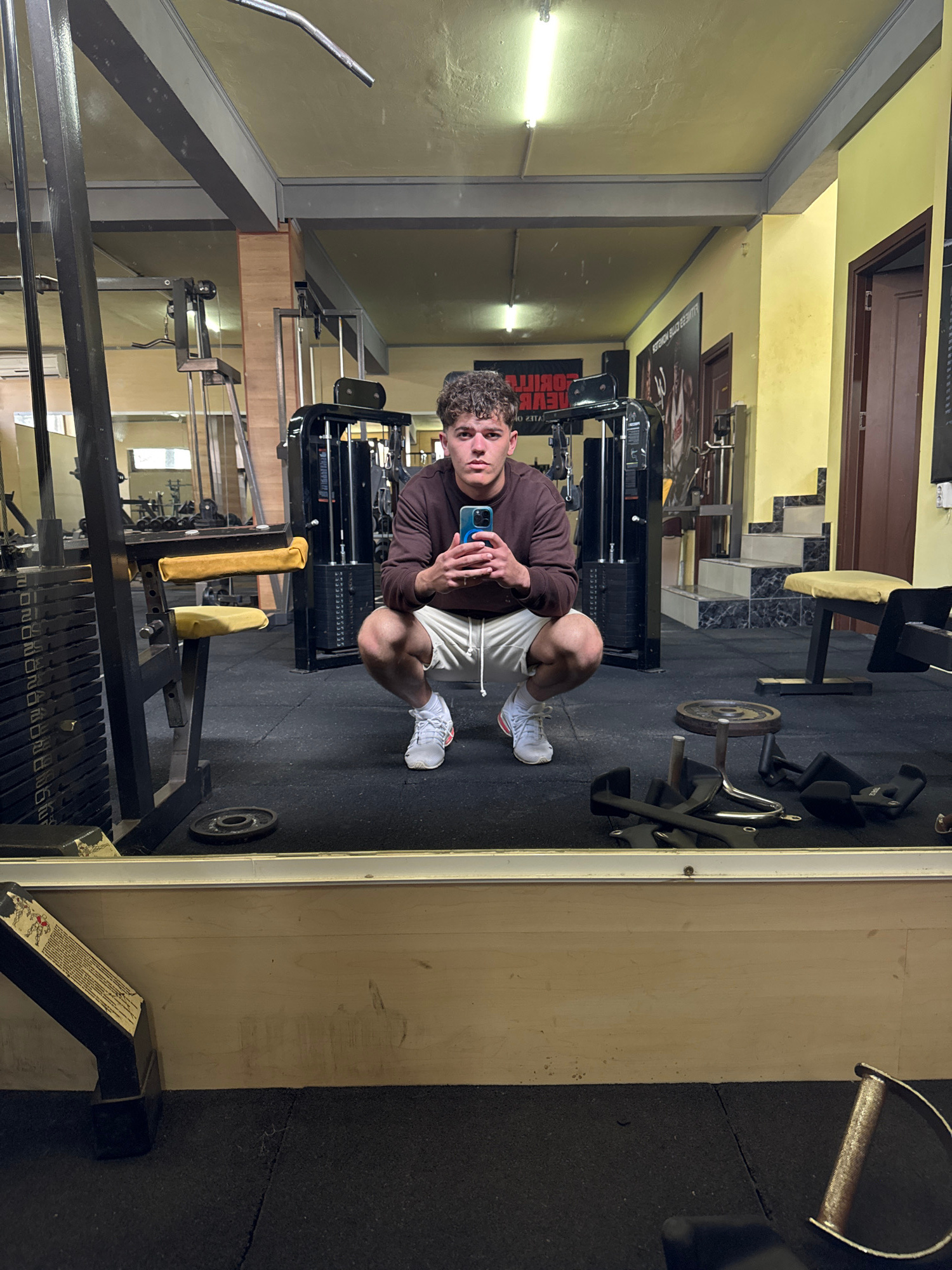 A man squats in front of a mirror in a gym in Goce Delcev, Bulgaria. He wears a brown sweatshirt, white shorts, and white sneakers, and holds a blue phone in his left hand. Various weight machines and…read more