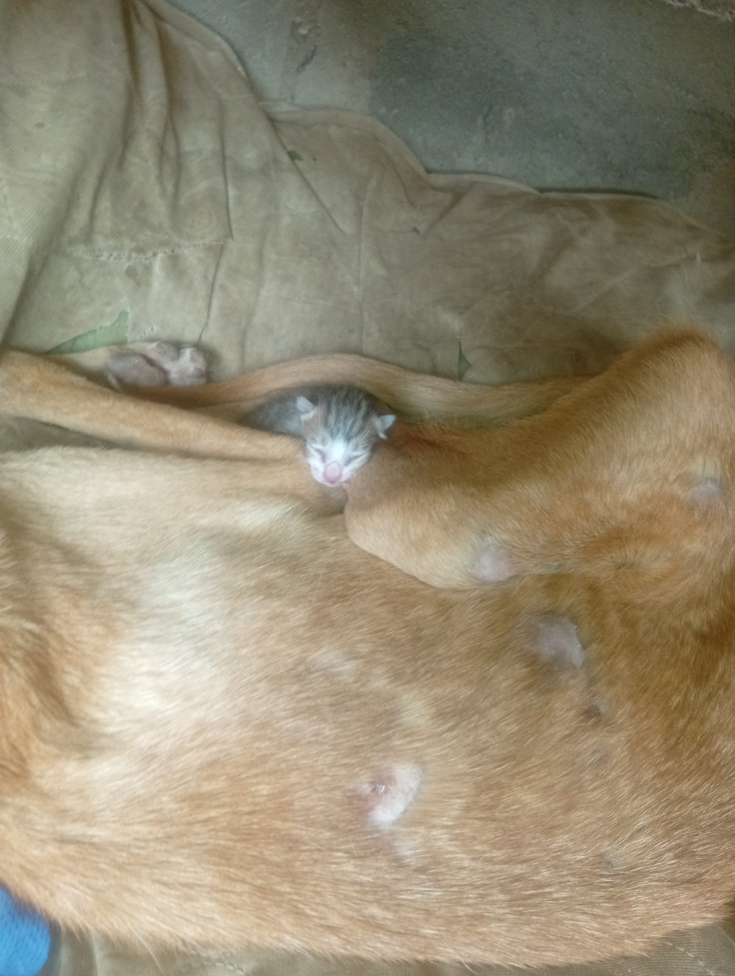 A close-up shot displays a newborn gray tabby kitten nestled on the back of an orange cat. The kitten's eyes are closed, and its pink nose is prominent against its light fur. The orange cat's fur show…read more