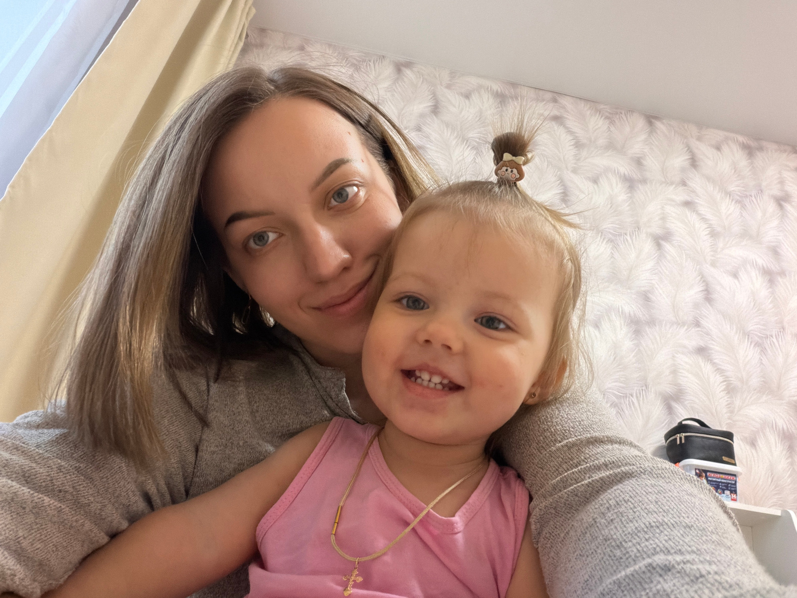 A woman and a young girl are close together, facing the camera. The girl wears a pink shirt and a necklace with a cross. The woman has long, light brown hair and is wearing a gray top. The background…read more
