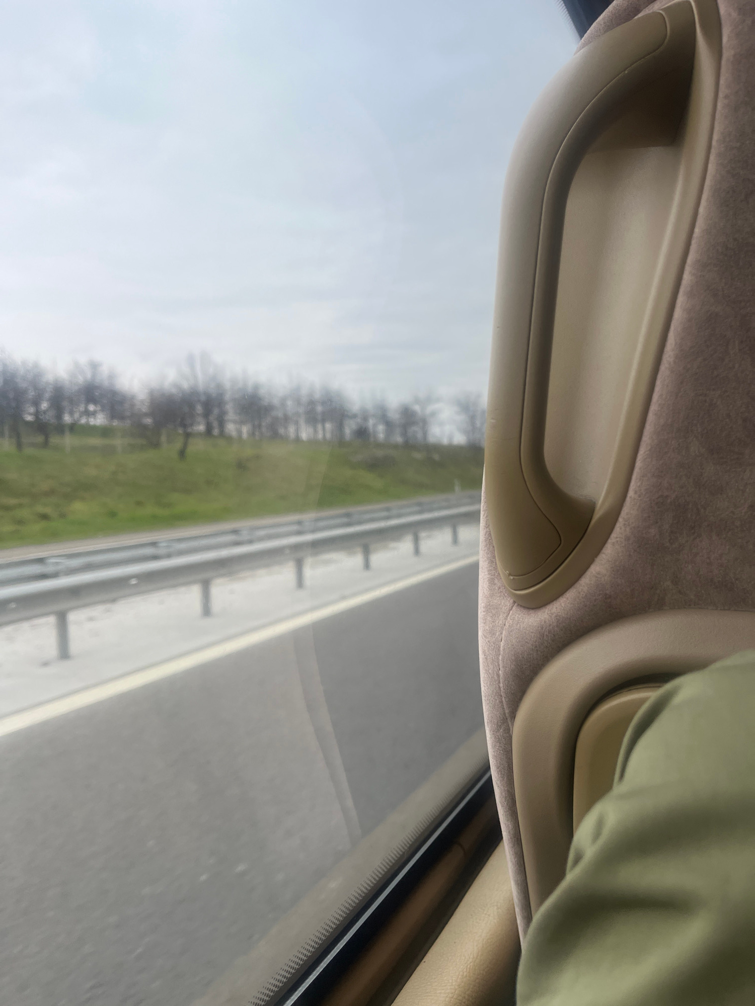 The image shows a view from inside a moving car. The window shows a view of a highway with a green field and trees next to it. Inside the car, there is a beige-colored handle attached to the ceiling,…read more