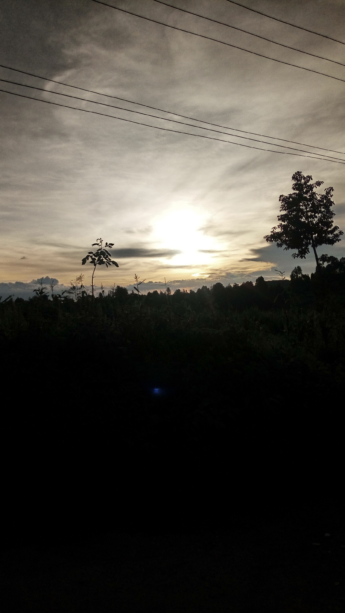 The image shows a rural scene in Ndeiya, Kenya, at sunset or sunrise. Overhead power lines are visible on the left, silhouetted against a cloudy sky. The horizon is marked by vegetation, including tre…read more