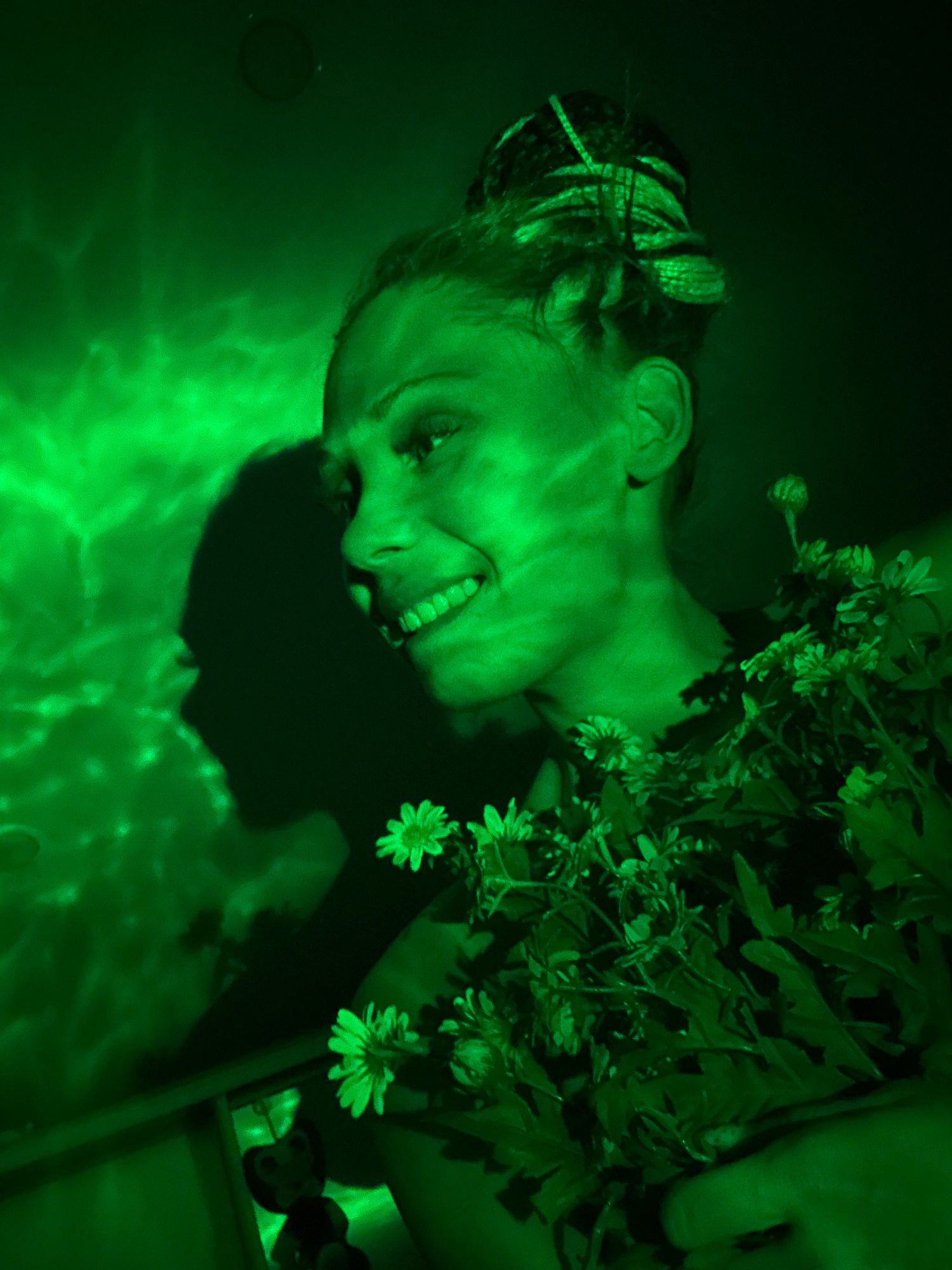 A woman with a bun hairstyle is lying down with green flowers around her face, possibly in a pool or bathtub due to the wavy green reflection at the bottom of the frame. The entire scene is bathed in…read more