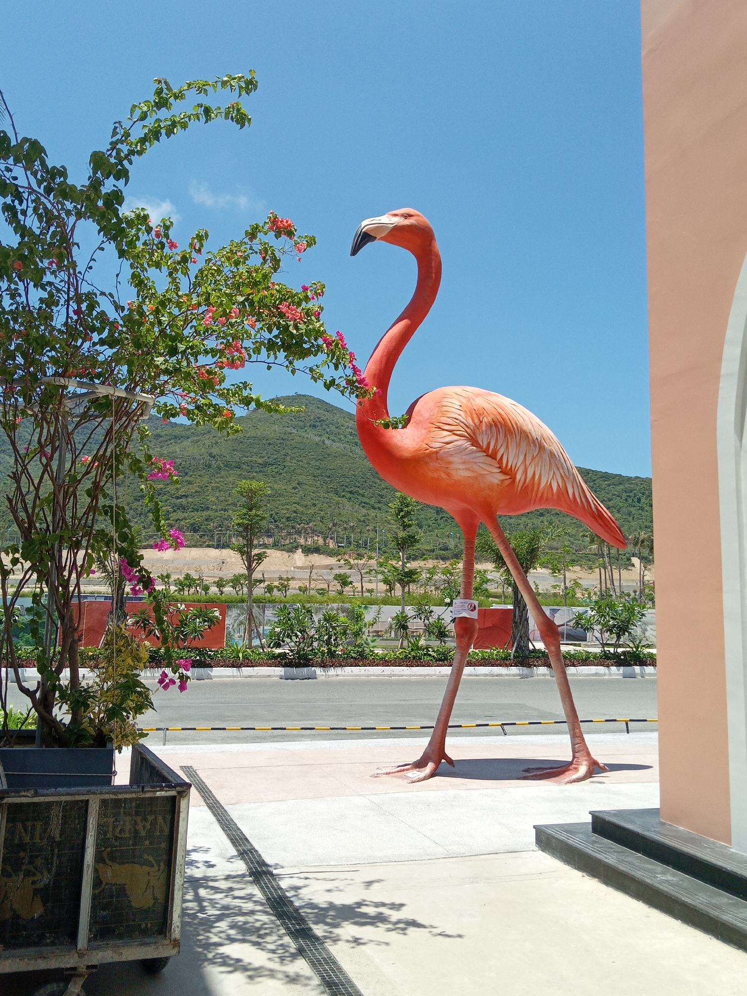 A large, detailed, reddish-orange flamingo statue stands upright on a light paved surface under a clear blue sky, facing left, with its head slightly turned and beak elevated. The statue's right leg b…read more