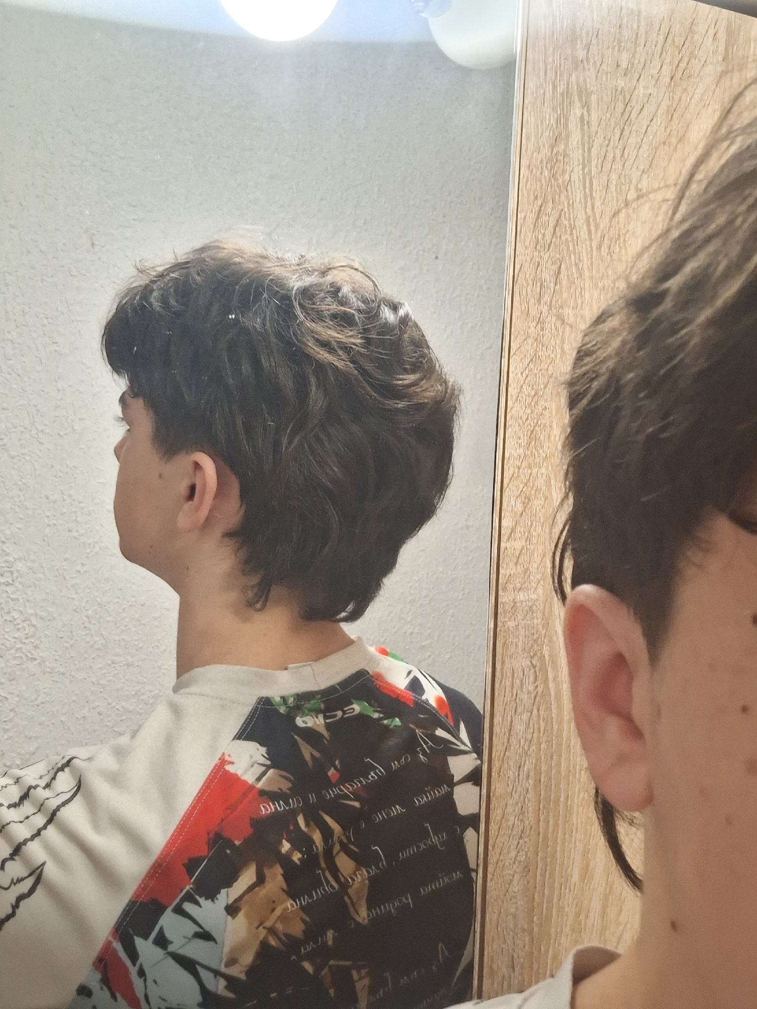 The image shows a person's reflection in a mirror. The person is wearing a t-shirt with a colorful, patterned design. The background appears to be a light-colored wall. The surface on which the mirror…read more