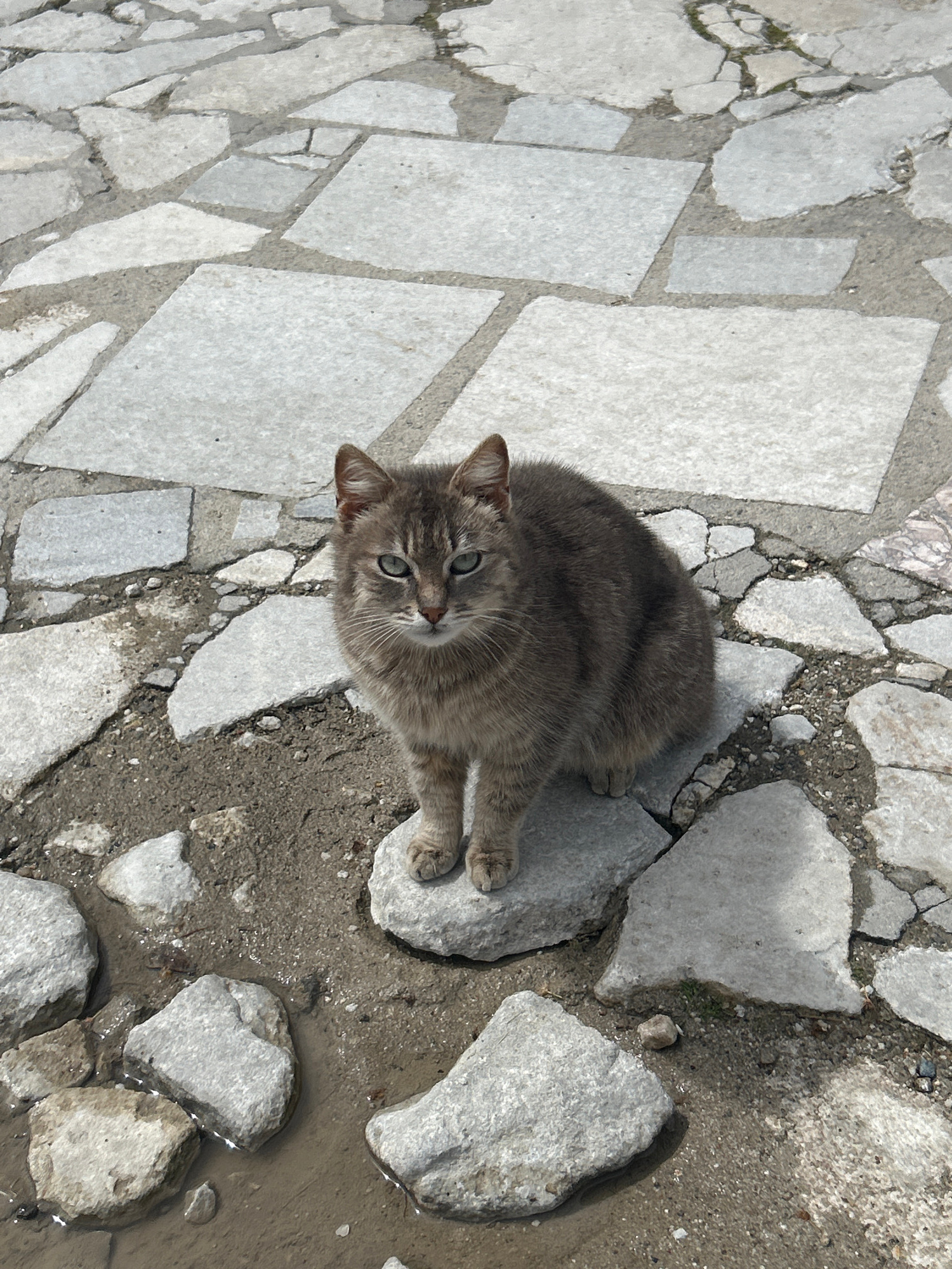 A gray tabby cat is lying on a surface of broken white marble tiles mixed with dirt and rocks. The area also appears to be damp with some standing water. The cat is looking up towards the camera with…read more