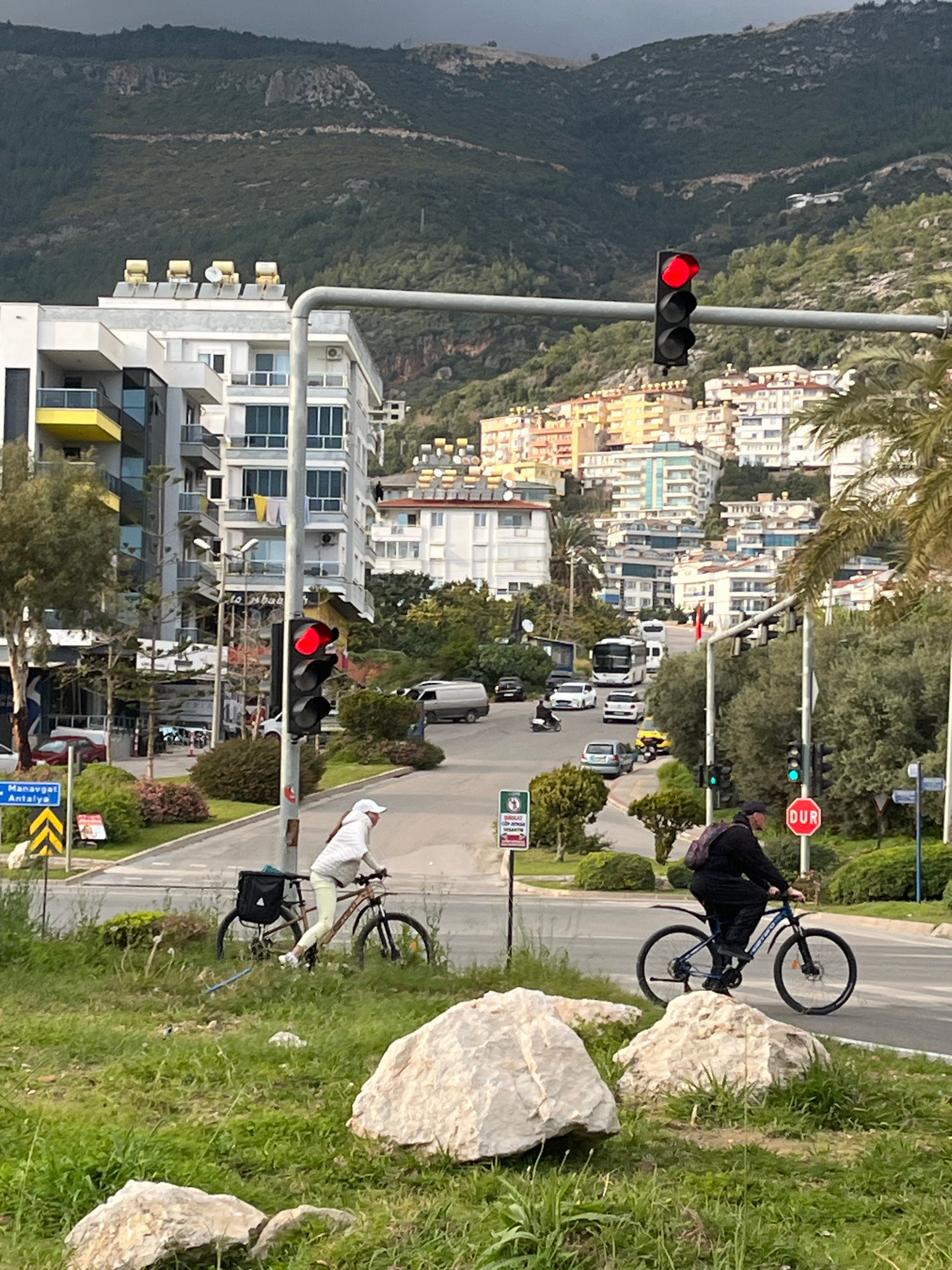 The scene depicts a vertical shot from what appears to be an elevated position on a hillside in Alanya, Turkey. The view overlooks a street running parallel to the coast. Along the roadside, two cyc…read more