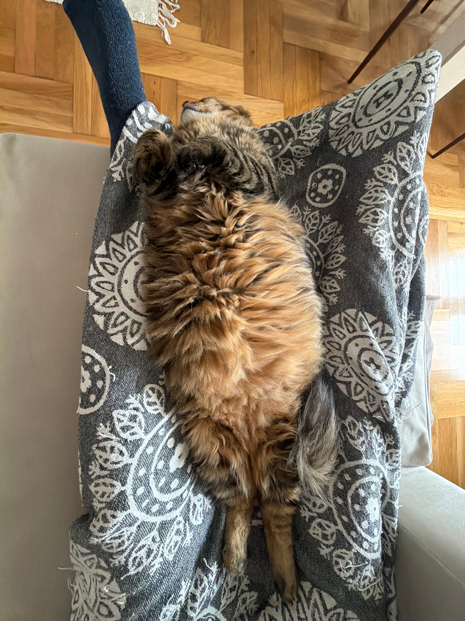 A medium-sized, long-haired tabby cat lies asleep on a patterned gray and white throw blanket draped over a light gray sofa. The cat is positioned on its side, with its head and front paws resting nea…read more