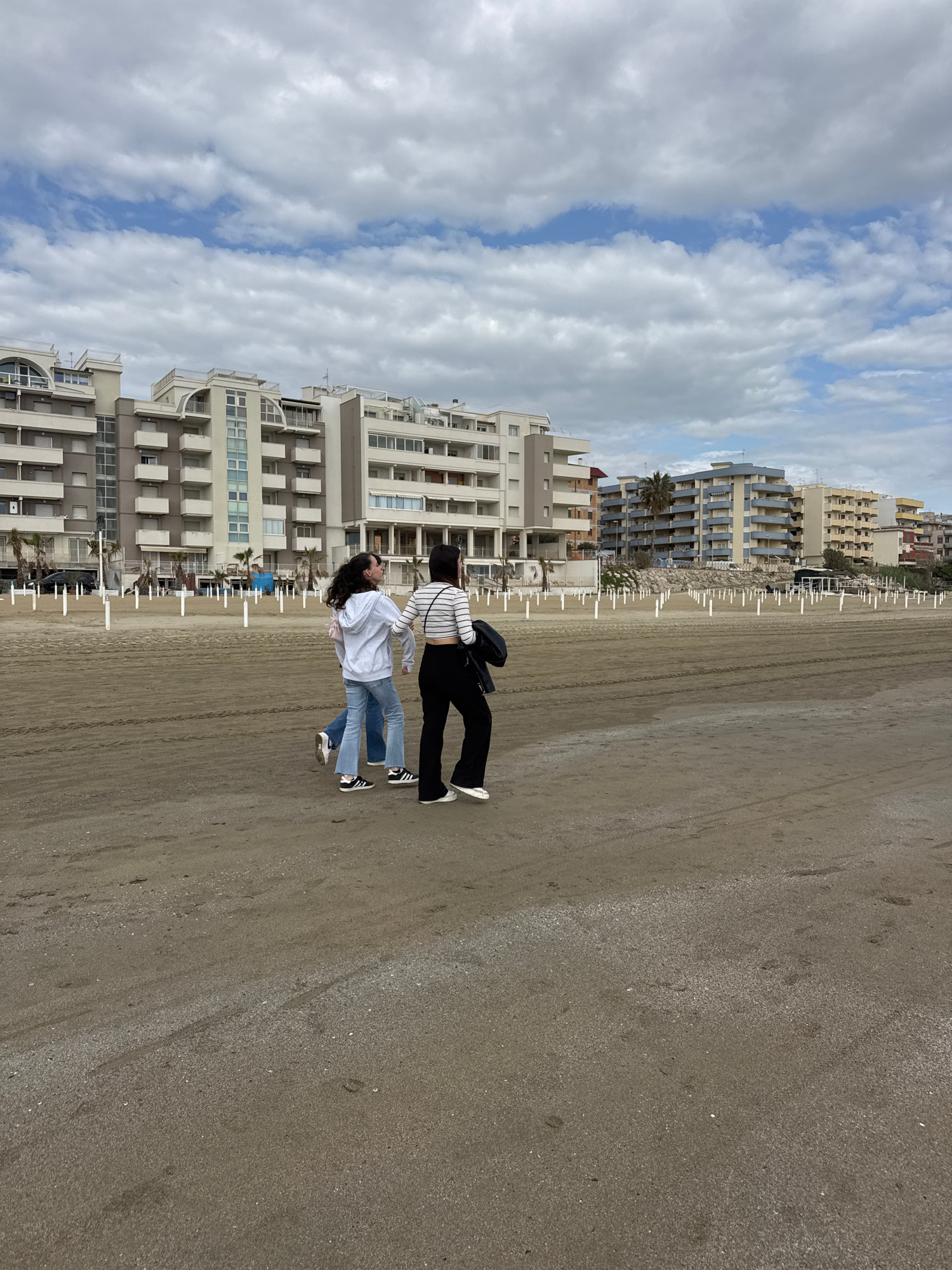 The image displays a coastal scene in Nettuno, Italy, featuring two young women on a wide sandy beach under a partly cloudy sky. The original image is rotated 90 degrees clockwise; when viewed upright…read more