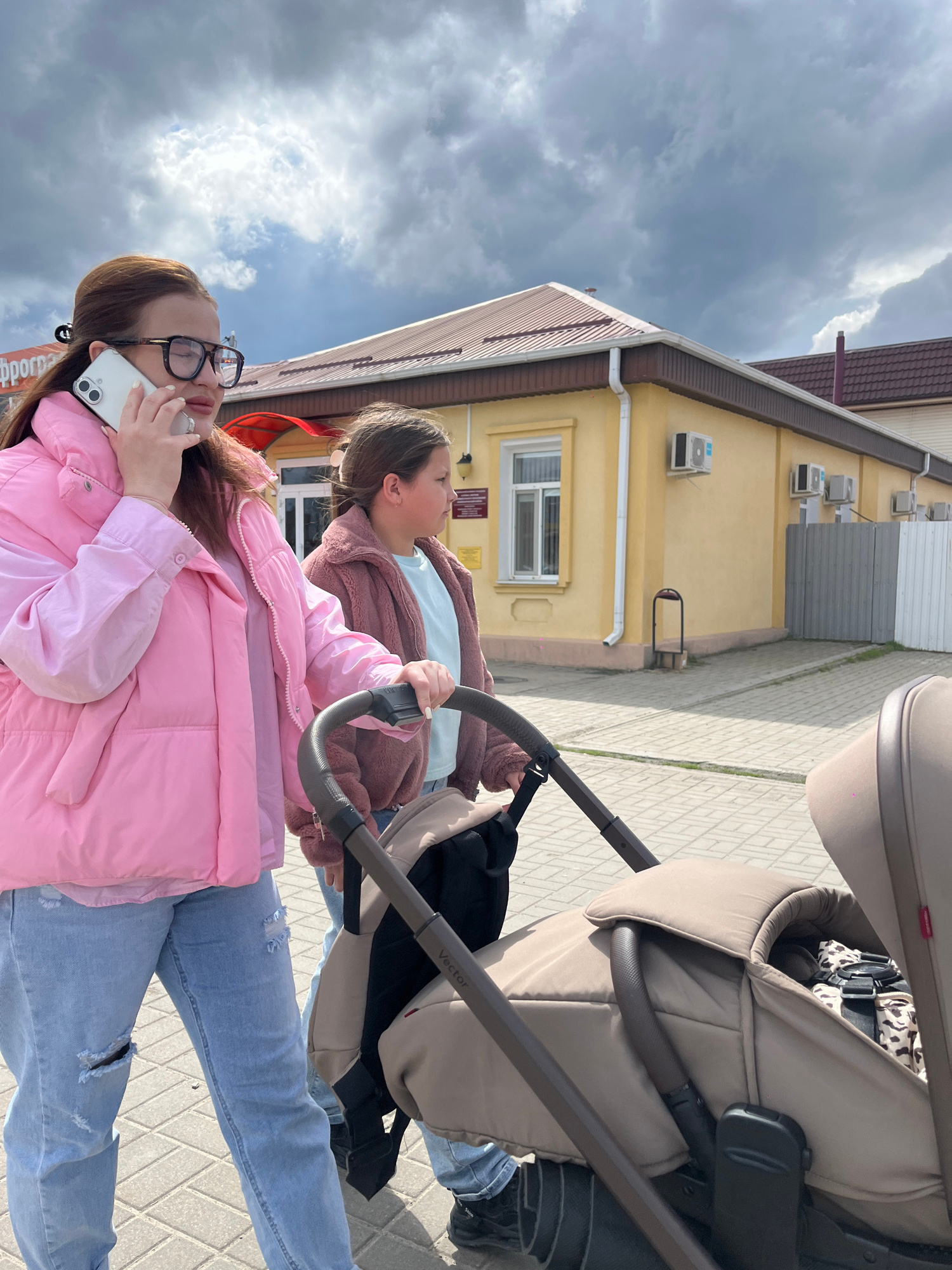 A photo shows two people on a paved street in Novopokrovskaya, Russia, next to a light yellow building with a brown roof. The person closest to the camera wears glasses, a pink jacket, and ripped jean…read more