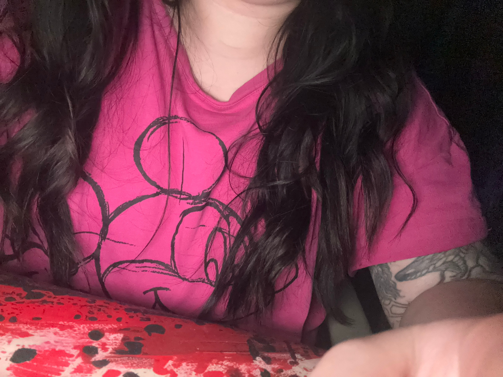 A close-up, high-angle shot shows a person's torso and face, mostly obscured by long, dark hair. The person is wearing a bright pink t-shirt with a black graphic design of circles. The subject's fair…read more