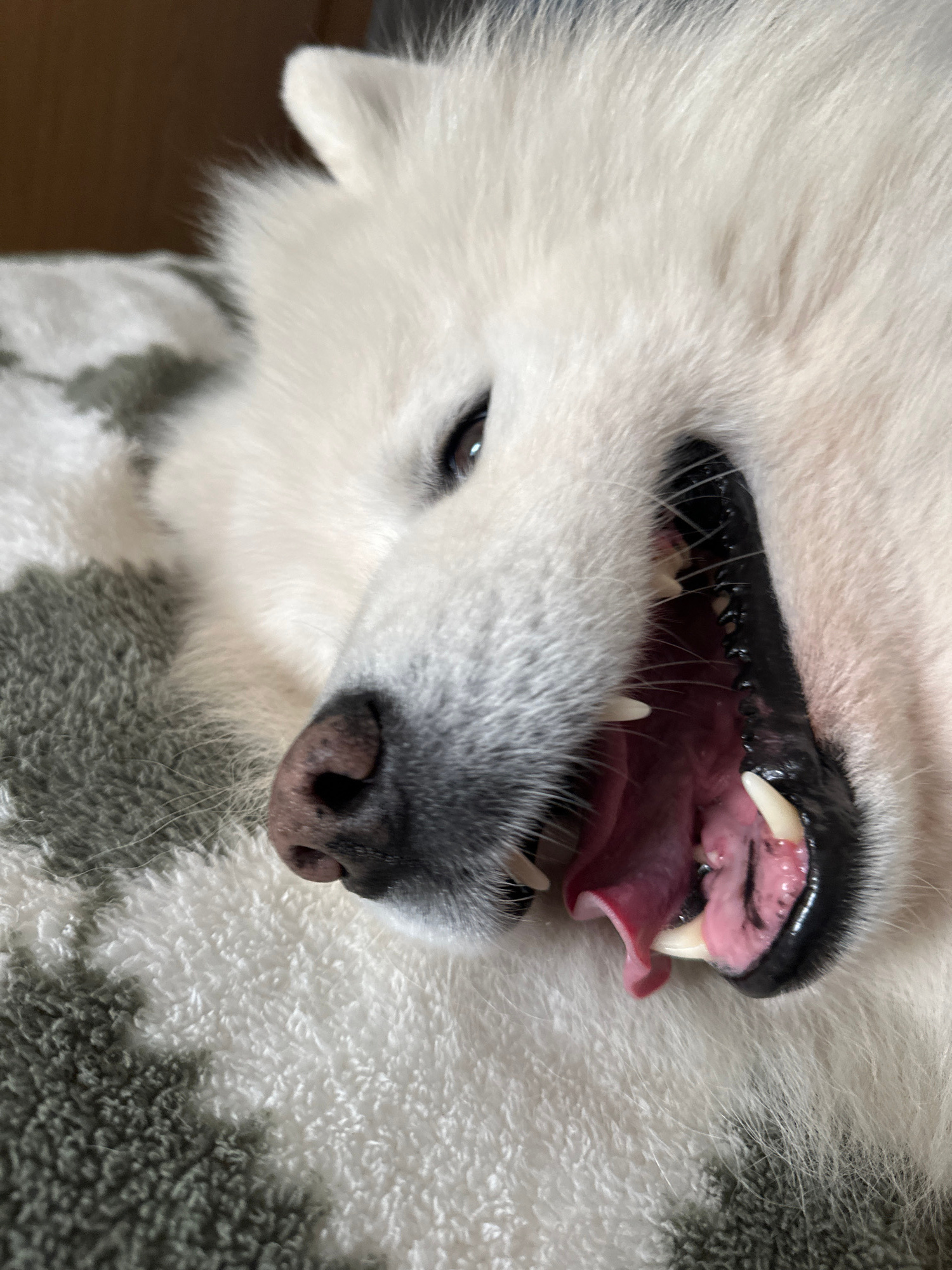 A white, long-haired dog, consistent with a Samoyed breed, is depicted in a close-up, high-angle shot, resting on a textured, patterned fabric blanket. The dog's mouth is open wide, revealing its pink…read more