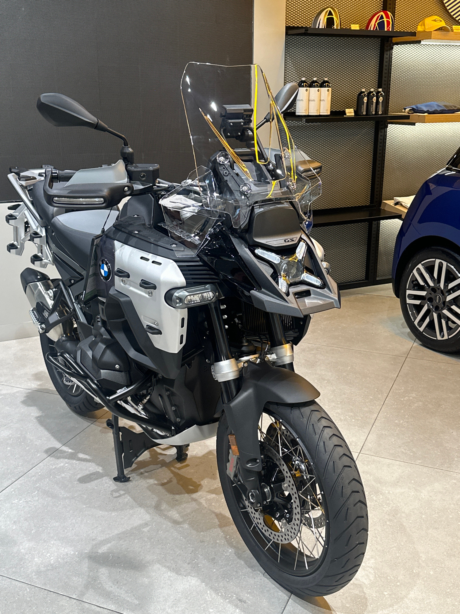 The image depicts a BMW R 1250 GS motorcycle displayed indoors, likely in a showroom or exhibition. The motorcycle is predominantly black and silver with a transparent windscreen. The front wheel is p…read more