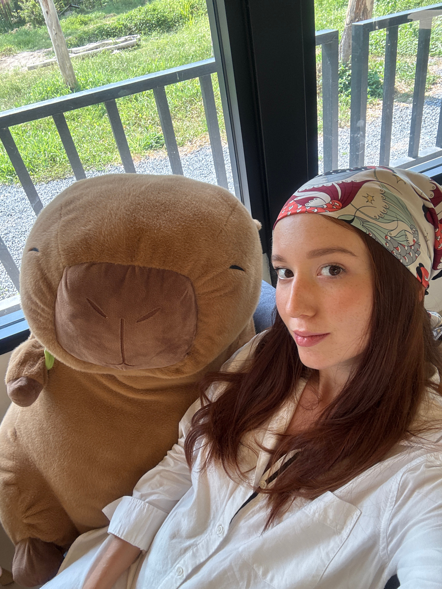 The image displays a woman and a large, brown plush toy, framed as if viewed from above or with the subjects reclined. The woman, with long, reddish-brown hair, has noticeable freckles and wears a whi…read more