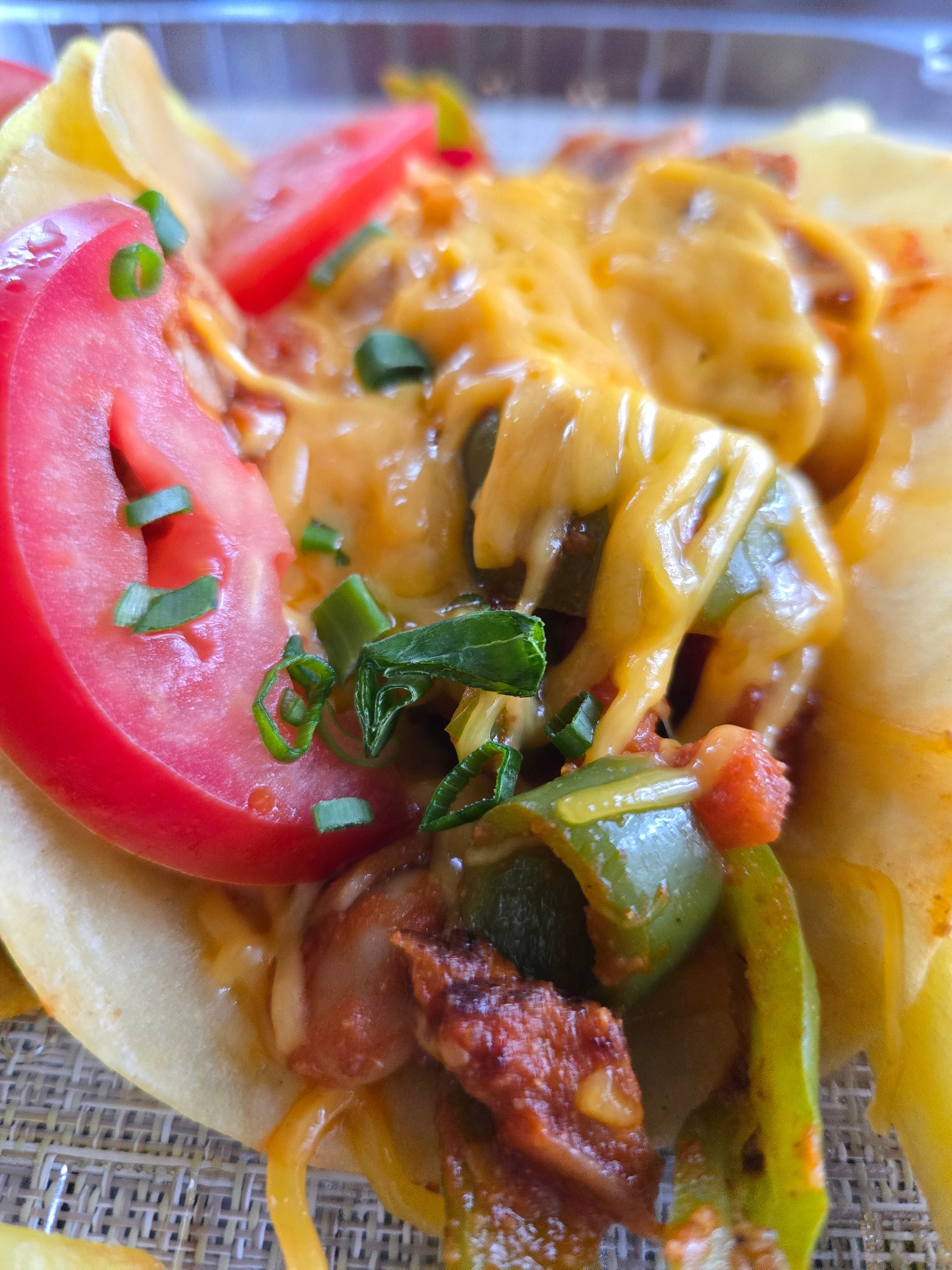 A close-up shot captures a partially obscured taco, likely situated in an unknown location, possibly a restaurant or food stall. The taco features a yellow tortilla, adorned with cooked peppers (both…read more