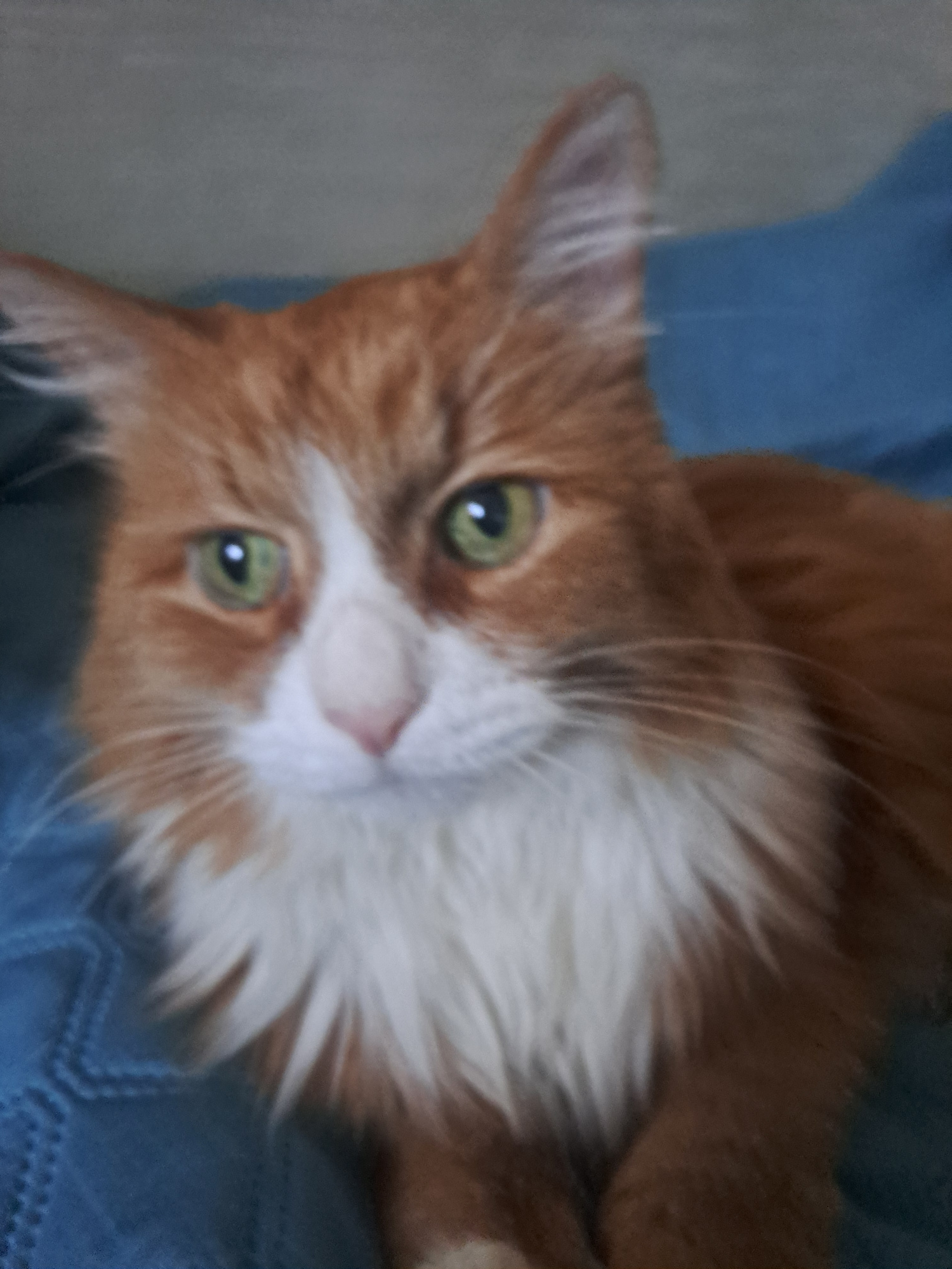 A close-up, slightly blurry, indoor shot features an orange and white cat with green eyes, lying on what appears to be a blue fabric surface. The cat is positioned with its head turned toward the view…read more