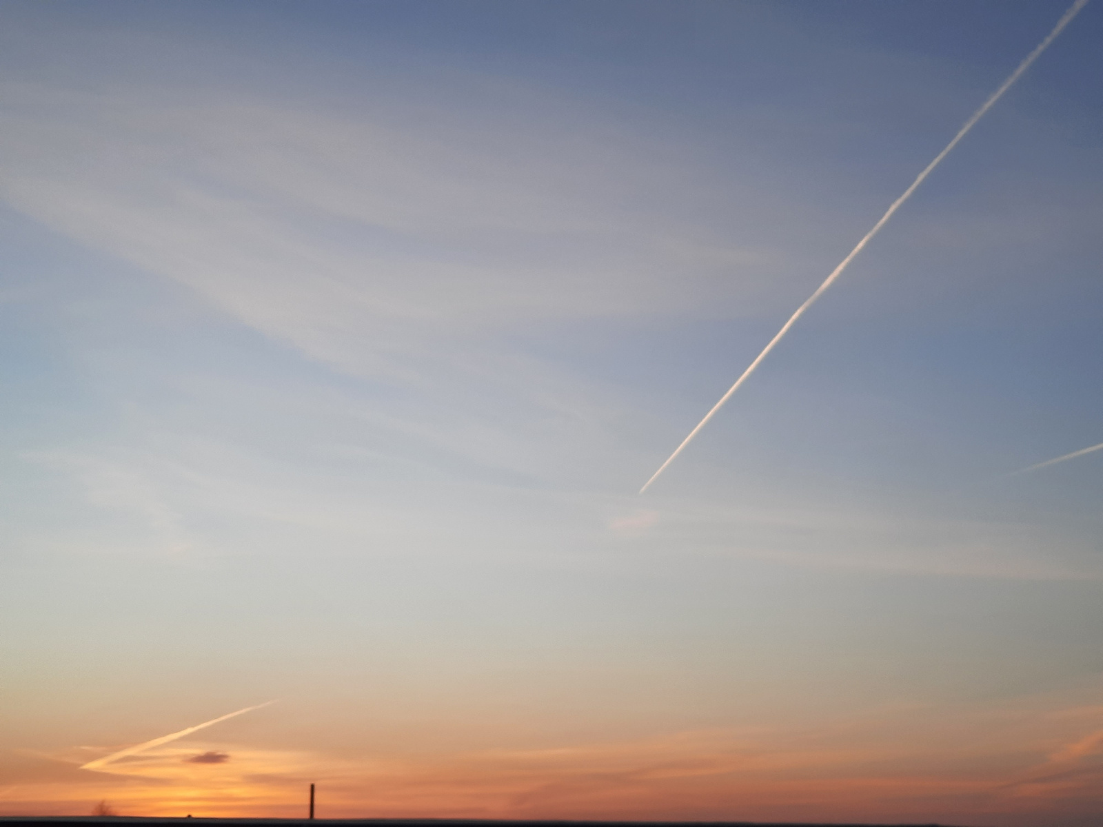 The image shows a sunset sky with several contrails. The sky transitions from blue at the top to orange near the horizon. Three distinct contrails are visible: a long, straight one angling from the up…read more
