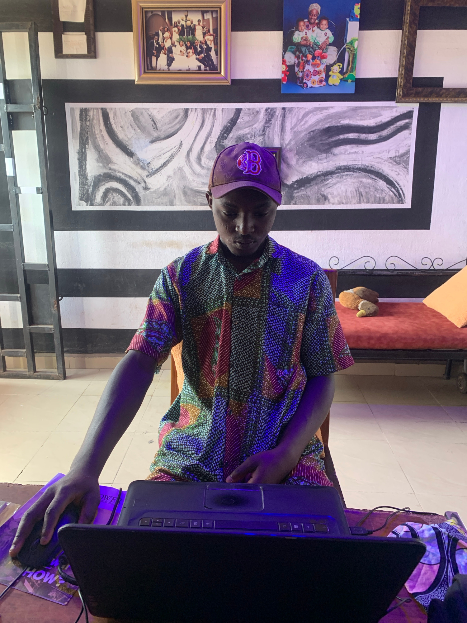 A man wearing a patterned shirt and cap is working on a laptop. The laptop is open, and his right hand is using a mouse. The background includes a wall with black and white stripes and framed pictures. The scene appears to be indoors. There is no information given from the image that can be used to determine that this scene is in the city of Jos, Nigeria. | Open Wire