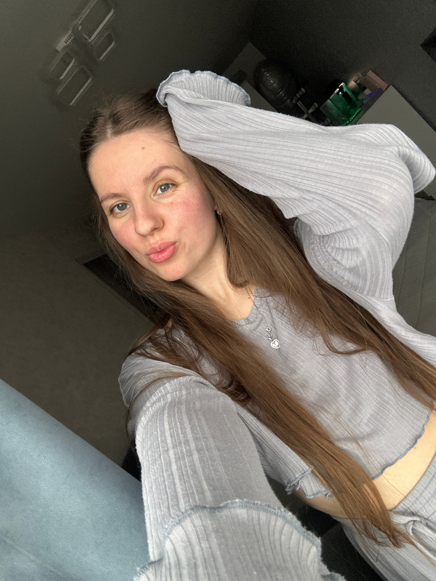 A young woman with long brown hair is lying down, facing the camera. She is wearing a light blue ribbed top and bottoms. Her head is tilted slightly. The background is dark and indistinct. It is not p…read more