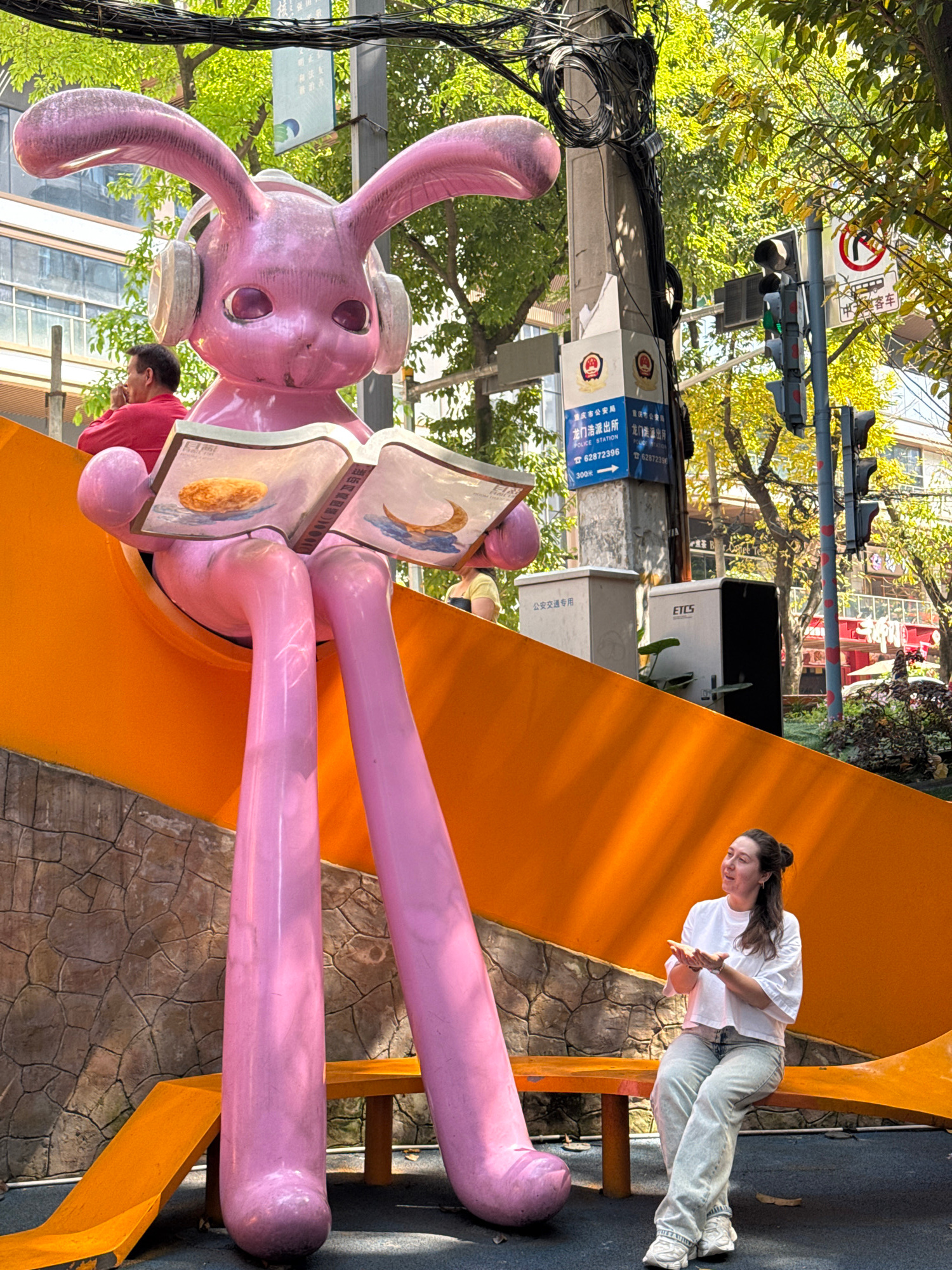 This image depicts a vibrant outdoor urban scene in Nan'an District, Chongqing, China, during bright daylight. The main subjects are a large pink rabbit sculpture and a woman interacting with it. The…read more