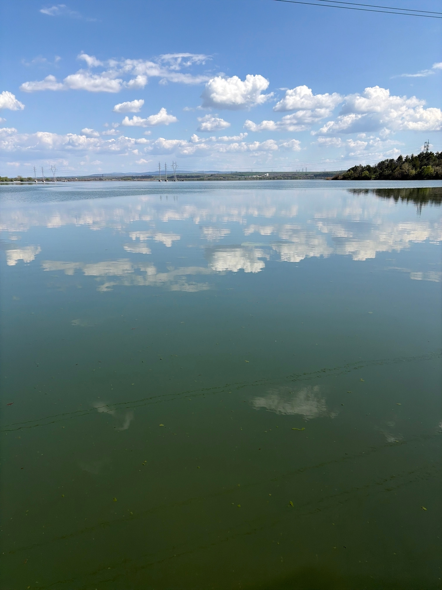 The image shows a body of water, potentially a lake or river, reflecting a blue sky filled with cumulus clouds. A line of trees is visible in the distance, bordering the water. High-voltage power line…read more