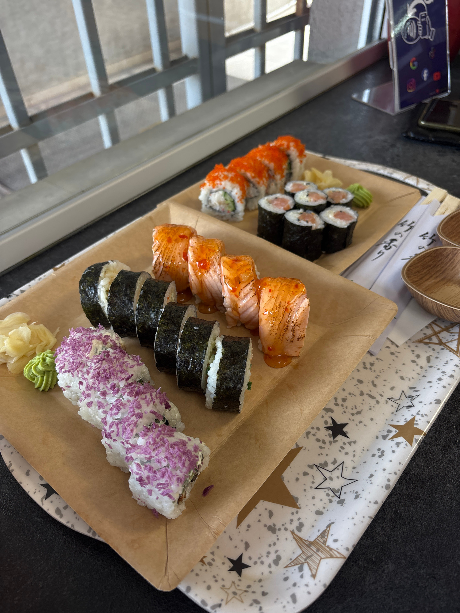 The image depicts a close-up shot of two brown paper trays filled with assorted sushi rolls. The sushi varieties include salmon nigiri with a glaze, California rolls coated in orange roe, cucumber and…read more
