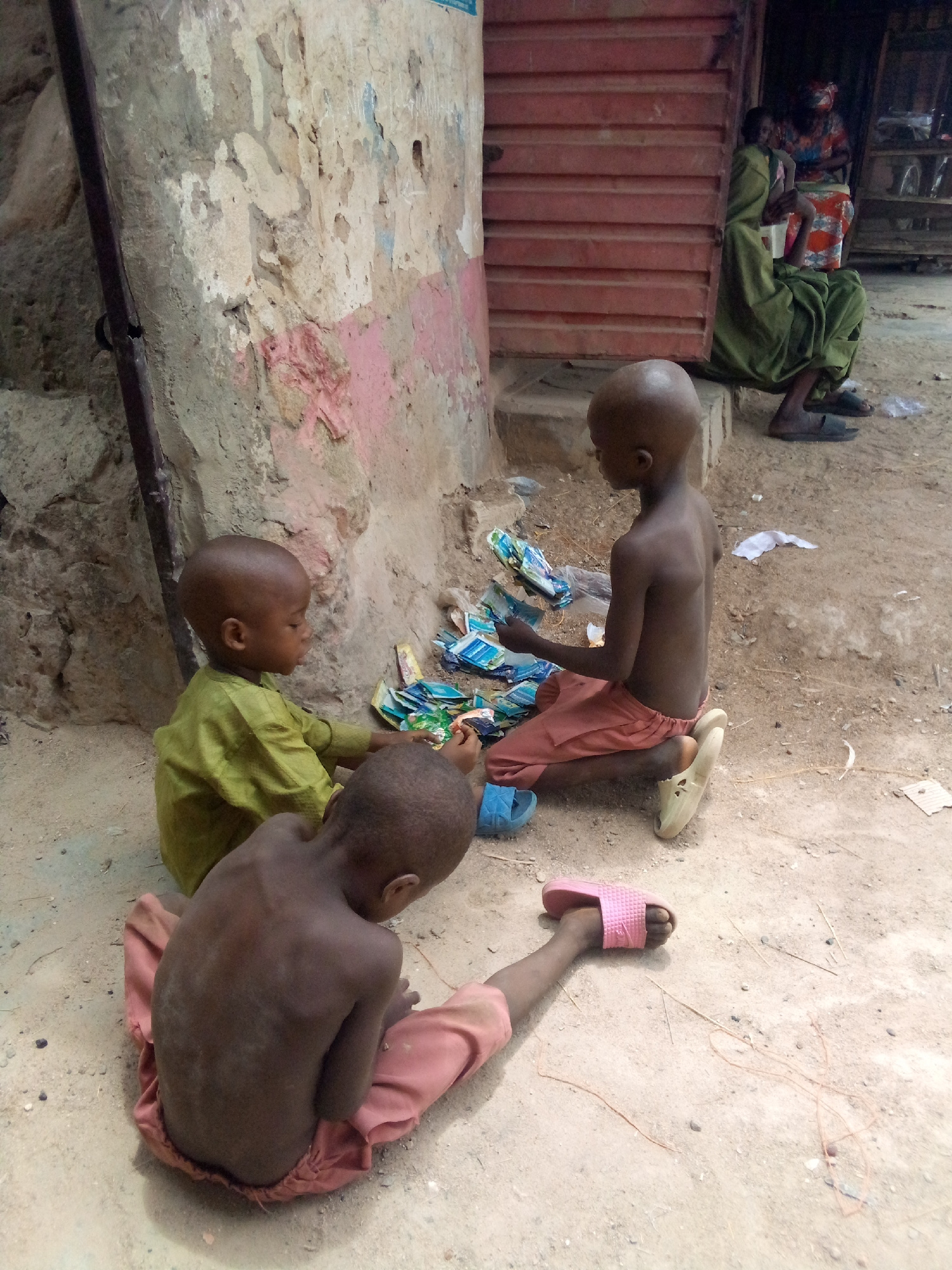 Three children are seated on the ground outside a building in Minna, Nigeria. The children are thin and appear to be playing with small, colorful packaged goods. One child wears a green shirt, another…read more