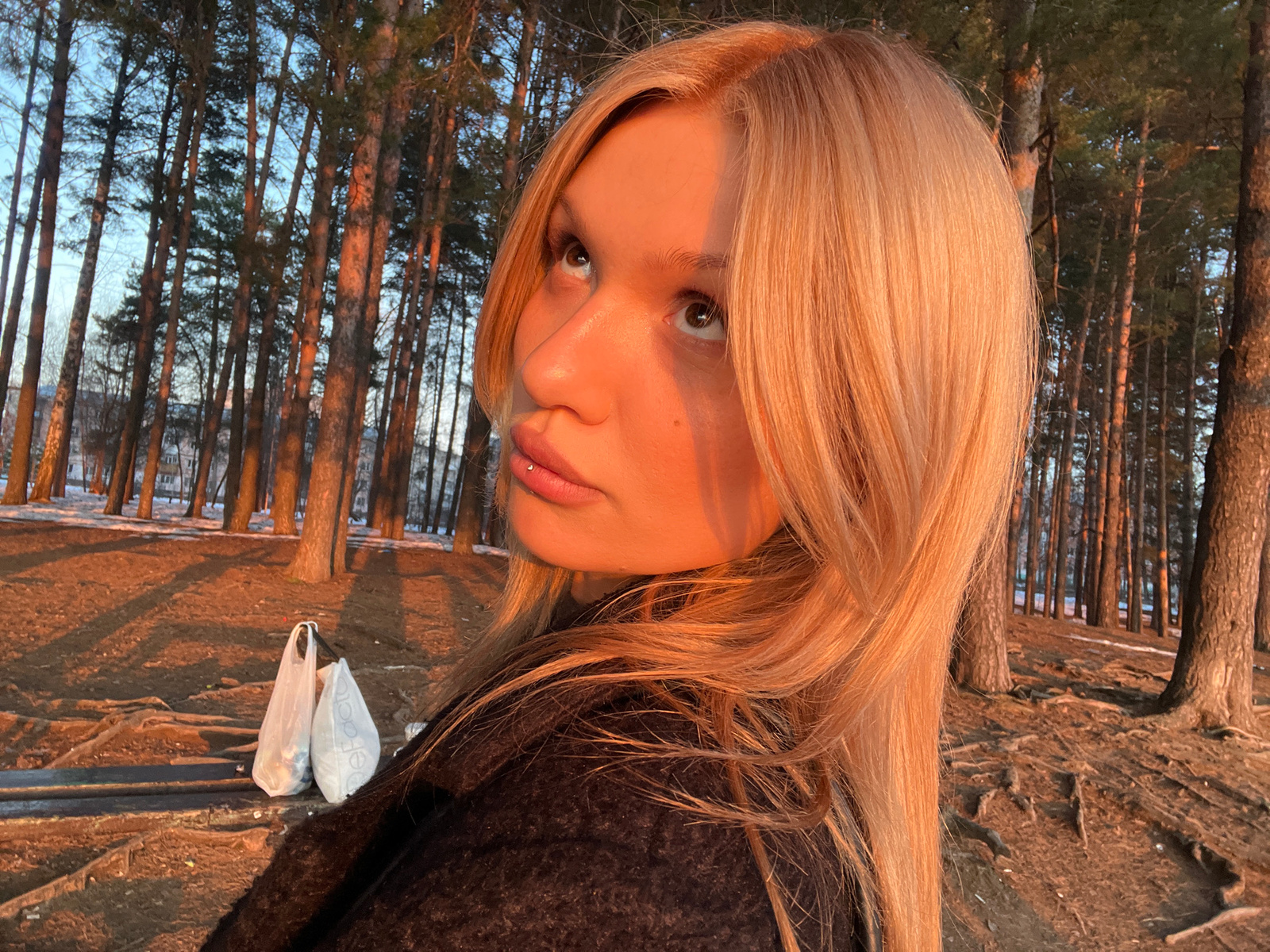 A photograph, rotated 180 degrees, features a young woman with long, light blonde hair. She is positioned in front of a wooded area. The background consists of many tall, thin trees that obscure a bod…read more