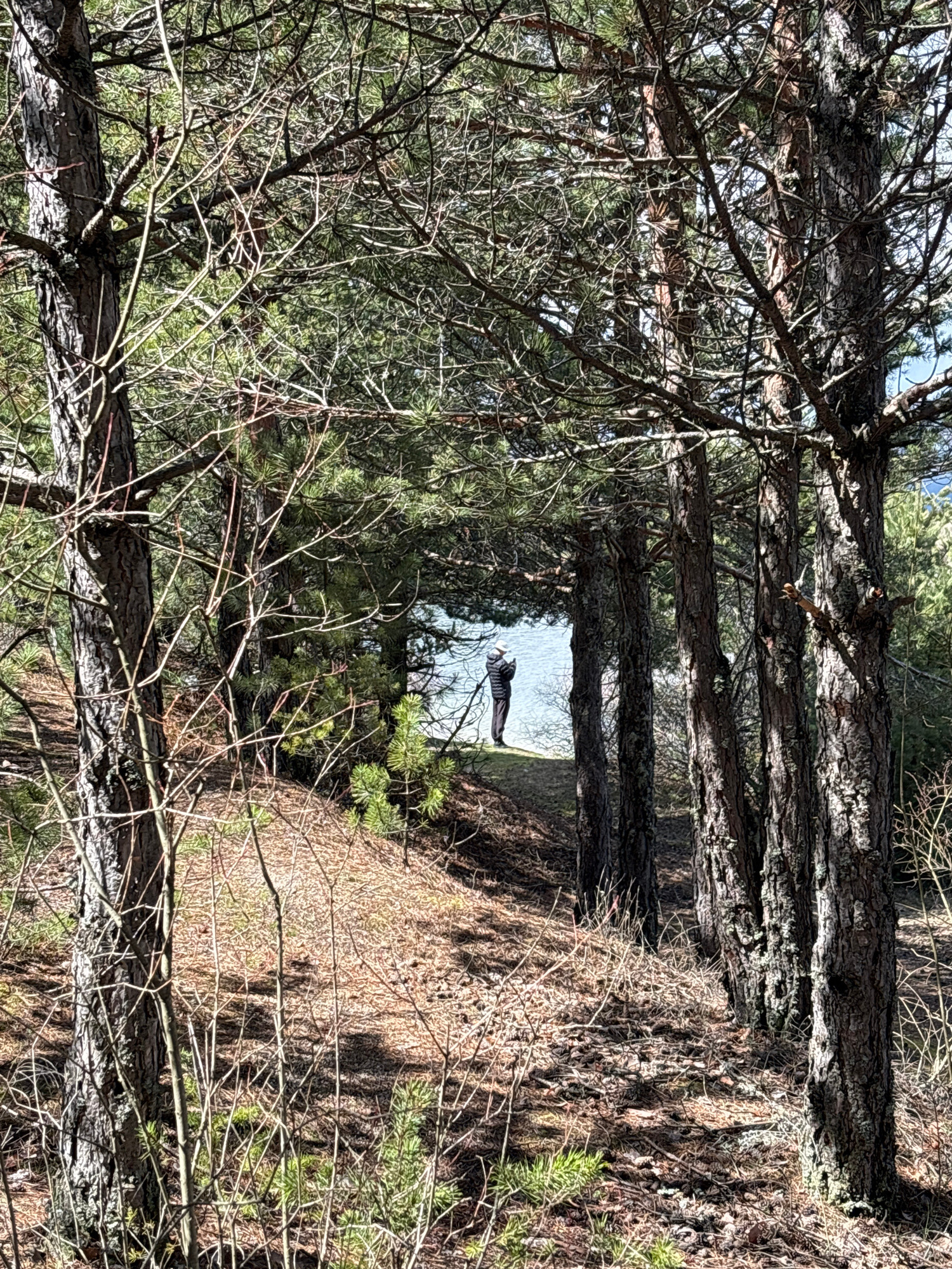 The image shows a view through a forest towards water. Trees with rough bark dominate the foreground and middle ground, partially obscuring a body of water. A person stands at the edge of the water. T…read more