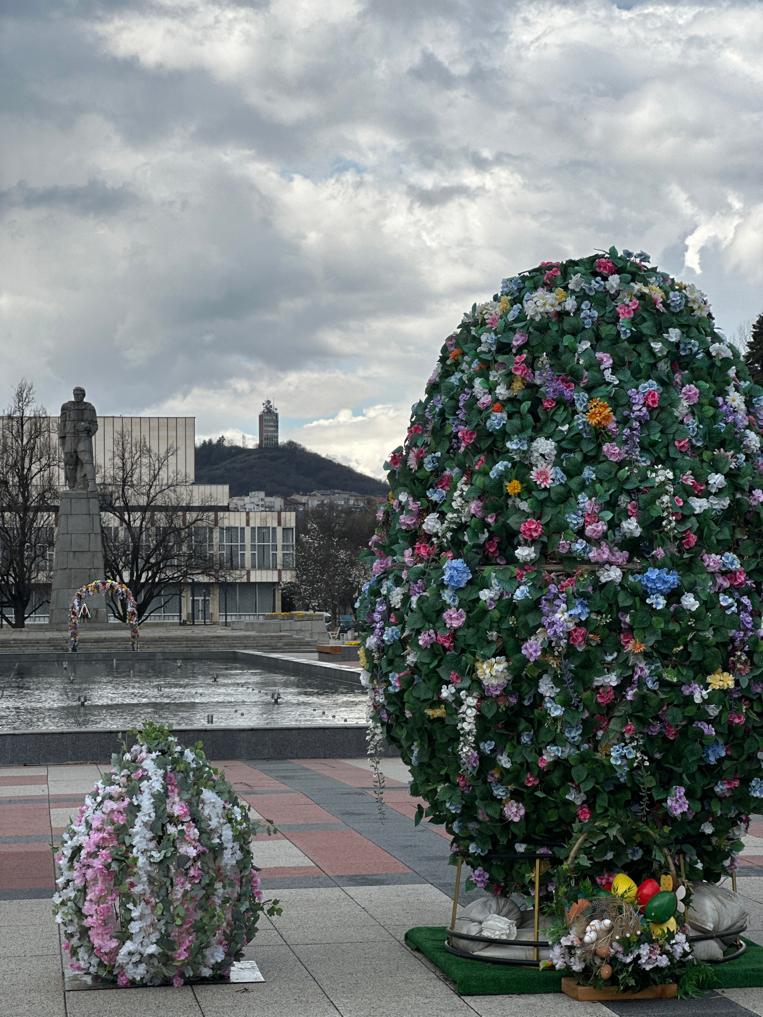The image shows a city square in Montana, Bulgaria, with large, spherical floral decorations in the foreground. The decorations are densely packed with flowers of various colors, with one notably larg…read more