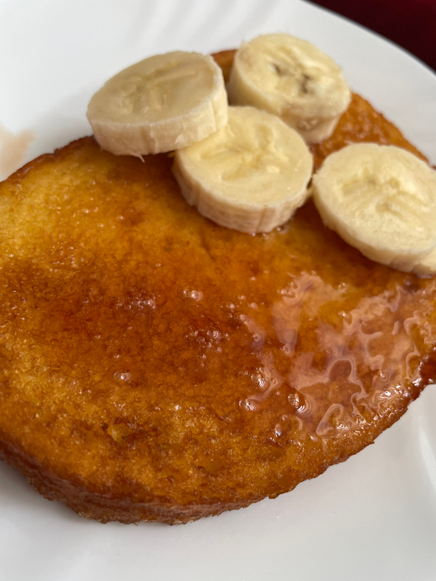 A close-up shot shows a pancake on a white plate topped with banana slices and syrup. The pancake appears to be golden brown and glistening with syrup. Four banana slices are placed on the left side o…read more
