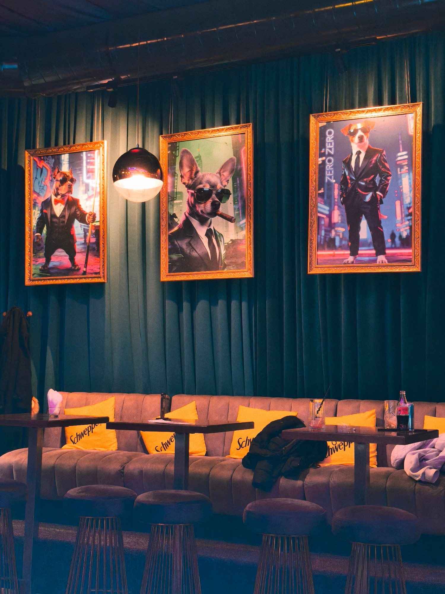 Indoor scene in a bar setting with three framed dog portraits hanging on a dark teal draped wall. The frames are gold colored. The portraits depict anthropomorphic dogs wearing sunglasses and dressed…read more