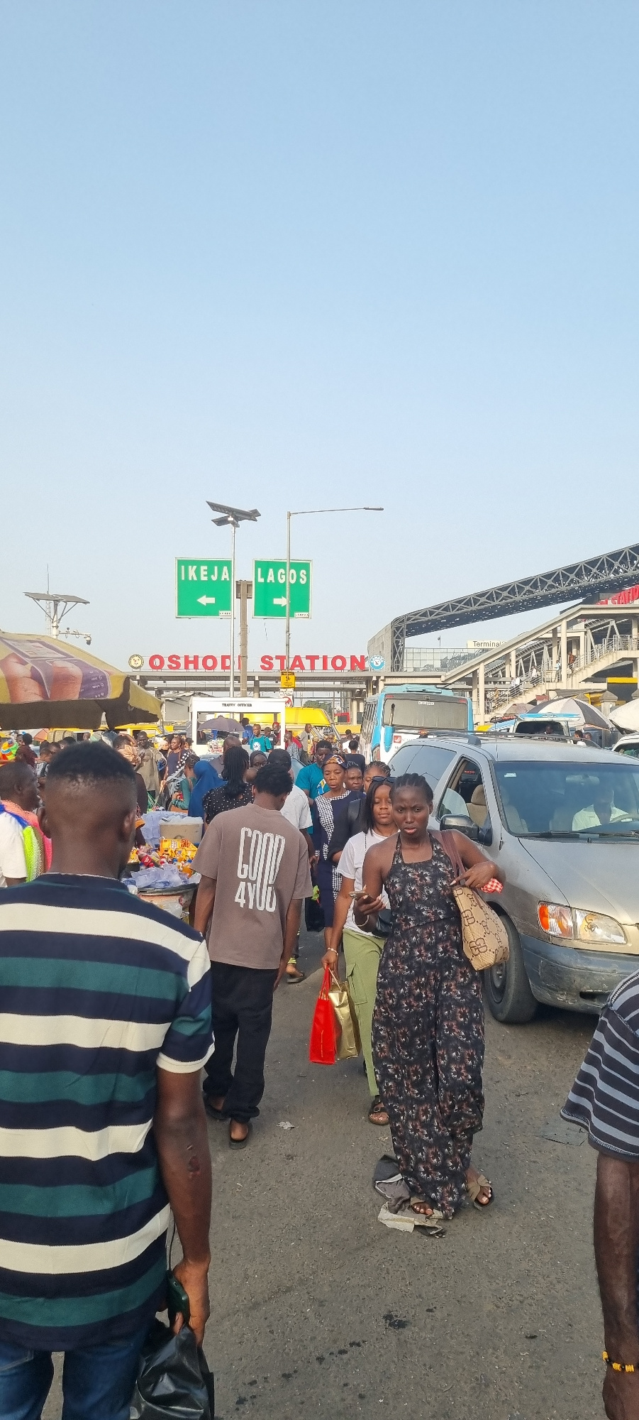 The image depicts a crowded street scene near Oshodi Station in Ikeja, Lagos, Nigeria. The foreground shows people walking, with a focus on their attire and personal belongings. Several individuals ar…read more