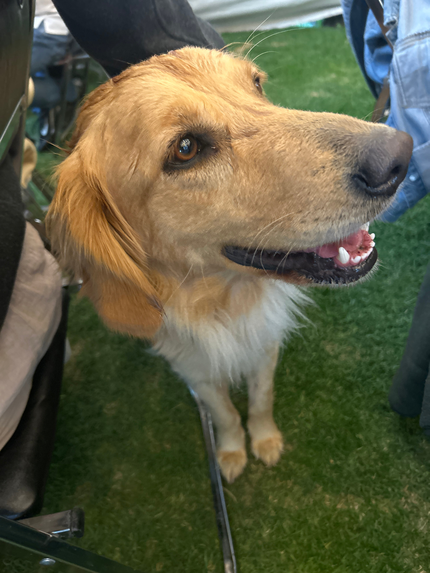 A close-up, angled view depicts a golden retriever with its head tilted back, mouth open, exposing teeth and tongue. The dog appears to be lying down, with its front paws visible on a patch of green g…read more