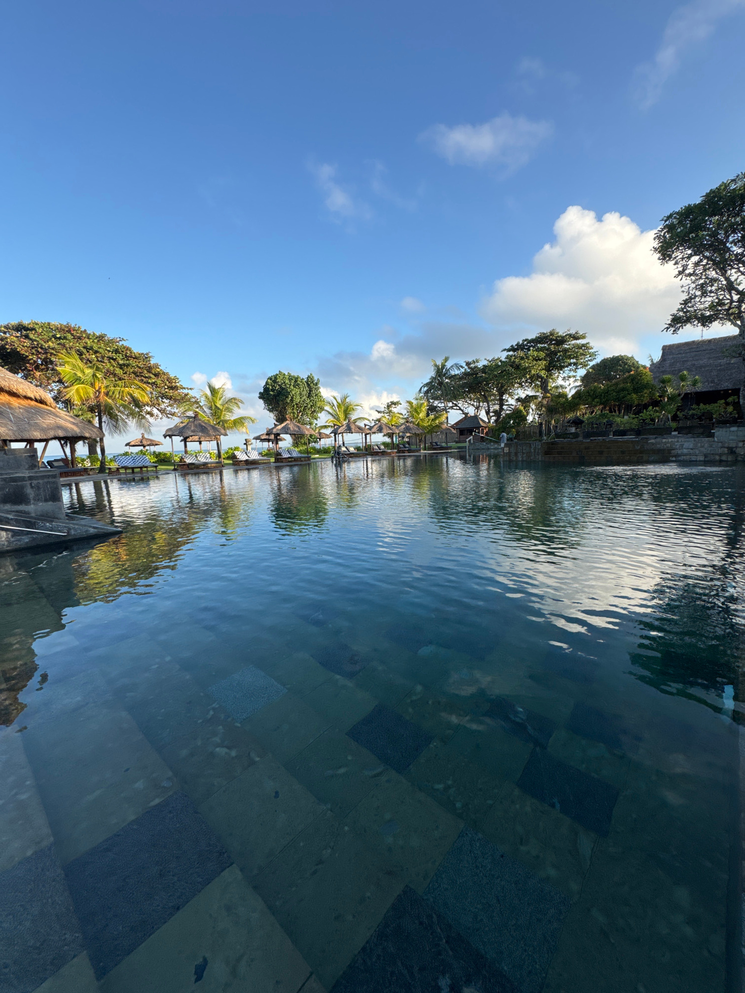 The image depicts a view from inside a pool at what is likely a resort in Jimbaran, Indonesia. The pool's water is clear with visible reflections of the sky and surrounding trees. The bottom of the po…read more