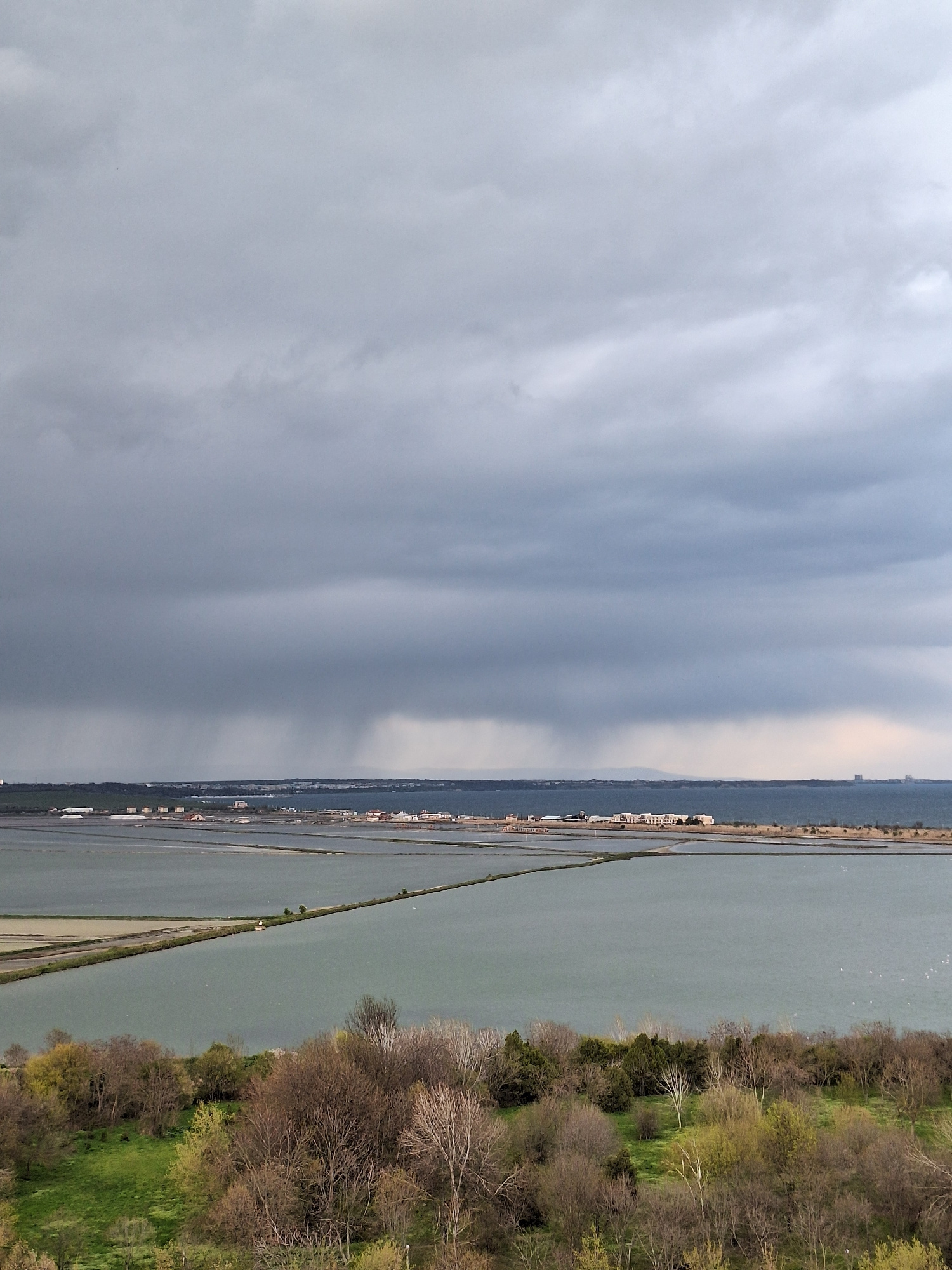 The image depicts a landscape near Burgas, Bulgaria, under a cloudy sky. The left side of the image is dominated by heavy, grey clouds. The right side features a body of water, likely a lake or the se…read more