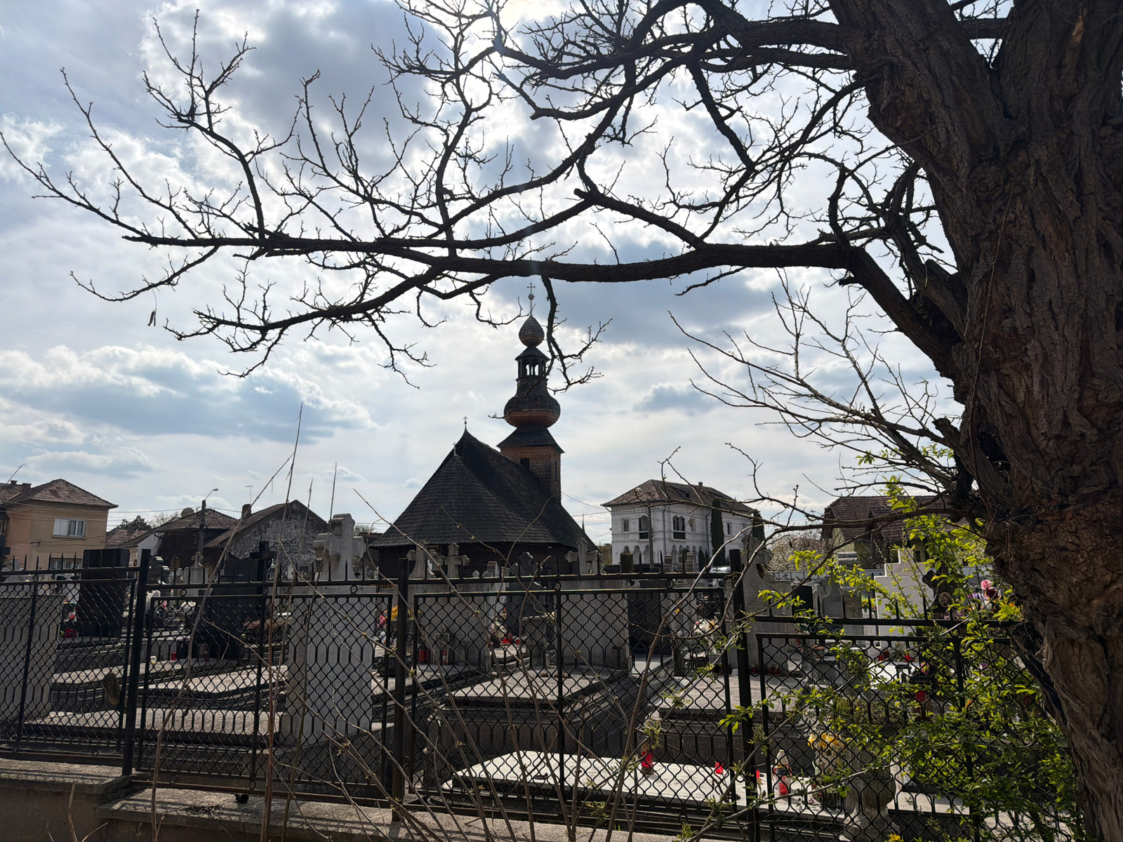 The image shows a cemetery in Târgu Mureș, Romania, viewed through the bare branches and trunk of a tree. The foreground features a black metal fence and a stone wall bordering the cemetery. Graveston…read more